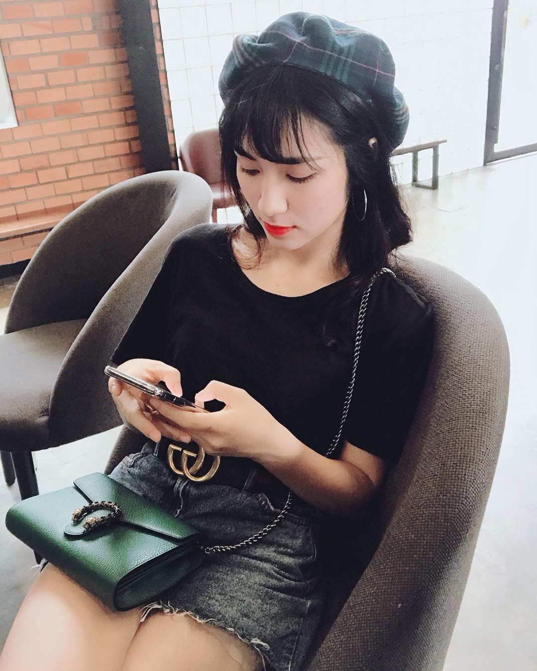 Hòa Minzy lựa chọn trang phục gồm áo phông và quần short jean năng động. Set đồ tuy đơn giản nhưng lại được nâng tầm rất nhiều lần nhờ những phụ kiện đi kèm như mũ nồi hay chiếc thắt lưng Gucci đắt giá.