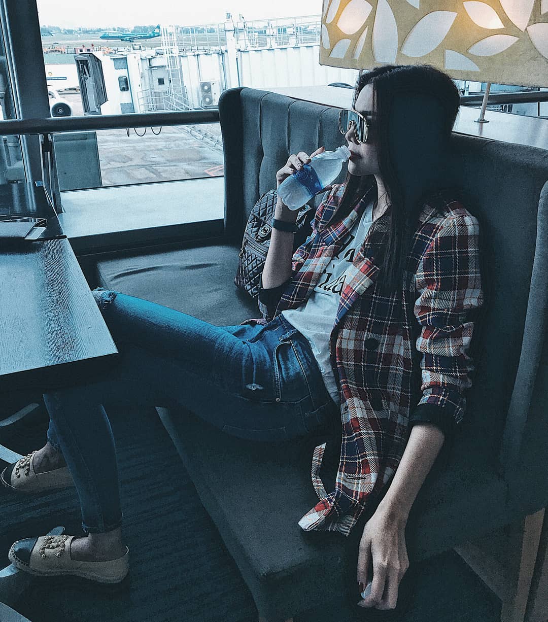 Thanh Hằng tiếp tục trung thành với chiếc kính mát độc, lạ hiệu Gentle Monster của mình. Siêu mẫu phối cùng áo phông, quần jeans và áo blazer họa tiết ca-rô. Set đồ đơn giản nhưng được nâng tầm lên rất nhiều với những phụ kiện đắt giá như giày loafer Gucci, ba lô da bê của Chanel.