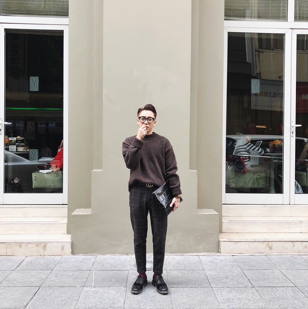 Trung thành với phong cách thanh lịch, stylist Hoàng Ku lựa chọn set đồ gồm áo sweater chất liệu dệt kim và quần tây kẻ ca-rô. Ngoài ra, cách lựa chọn mặt dây lưng với đồng hồ cùng tông vàng ánh kim cực kì tinh tế cũng là 1 chi tiết các tín đồ thời trang có thể học hỏi.
