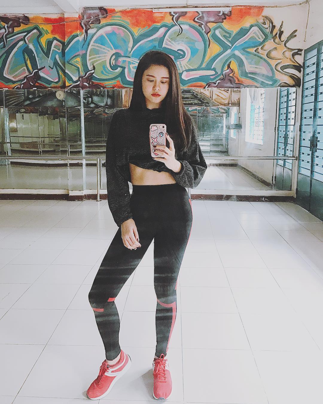 Set đồ gồm legging họa tiết và áo croptop của Trương Quỳnh Anh vừa đáp ứng đủ tính thời trang, cá tính, vừa dễ dàng để cô nàng thực hiện các bài tập vũ đạo. Nữ ca sĩ cũng đã thể hiện sự tinh ý khi phối màu quần và giày giống nhau, tạo nên tổng thể hoàn thiện.
