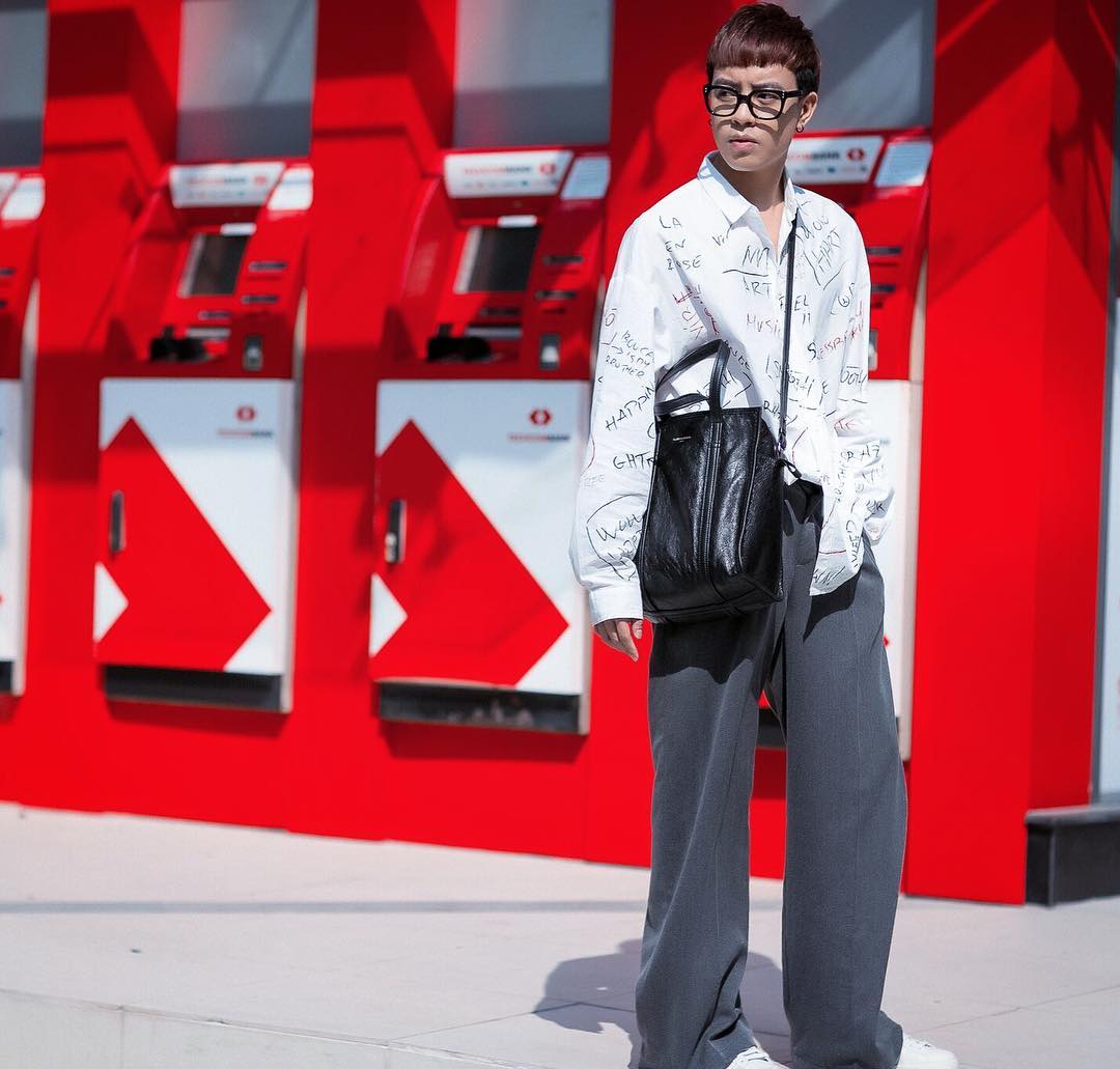 Stylist Huy Mạch xuống phố với set đồ độc, lạ gồm áo sơ-mi phom rộng in họa tiết chữ cái và quần ống suông. Chiếc túi da bóng đeo chéo làm điểm nhấn khiến set đồ trở nên hoàn hảo.