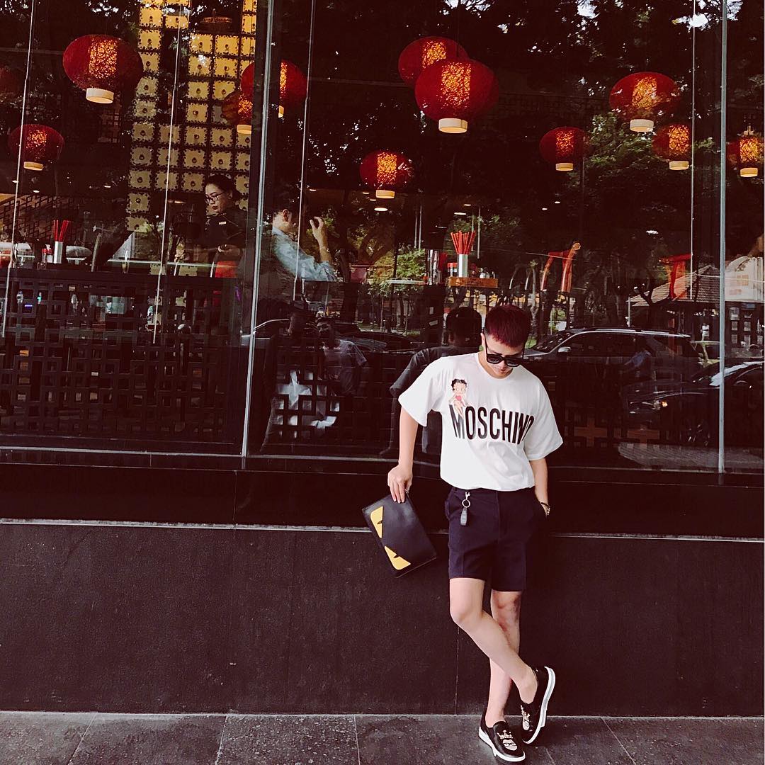 Duy Khánh Zhou Zhou xuống phố với set đồ gồm áo phông và quần short trẻ trung, trông đơn giản là thế nhưng chỉ riêng chiếc áo phông Moschino cùng clutch Fendi mà anh chàng đang cầm trên tay đã đủ khiến các tín đồ thời trang trầm trồ ngưỡng mộ.