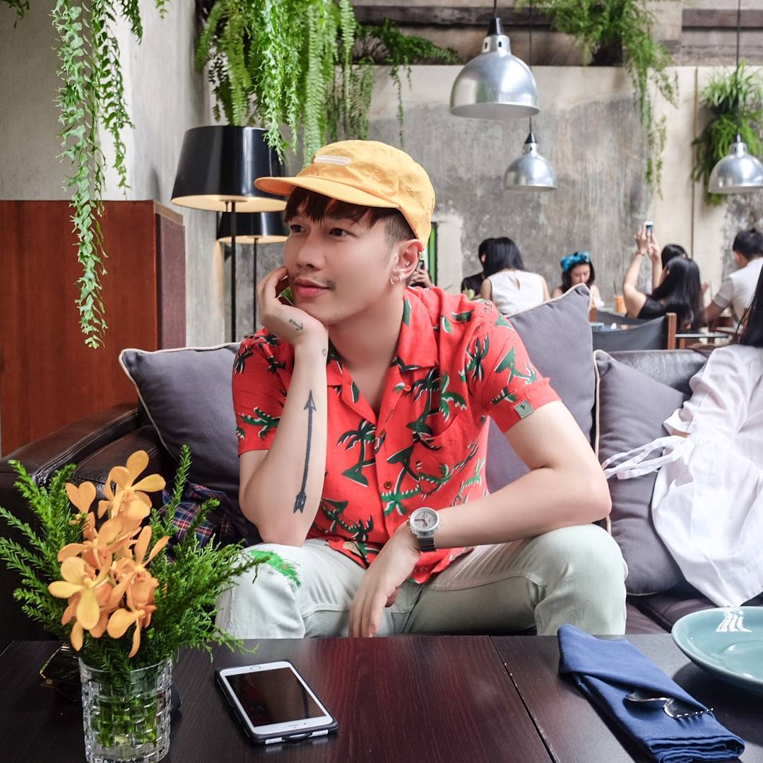 Stylist Lê Minh Ngọc khá trẻ trung với áo sơ-mi họa tiết nhiệt đới có tông màu cam bắt mắt, anh lựa chọn phối cùng mũ cam để tạo nên tổng thể phù hợp.