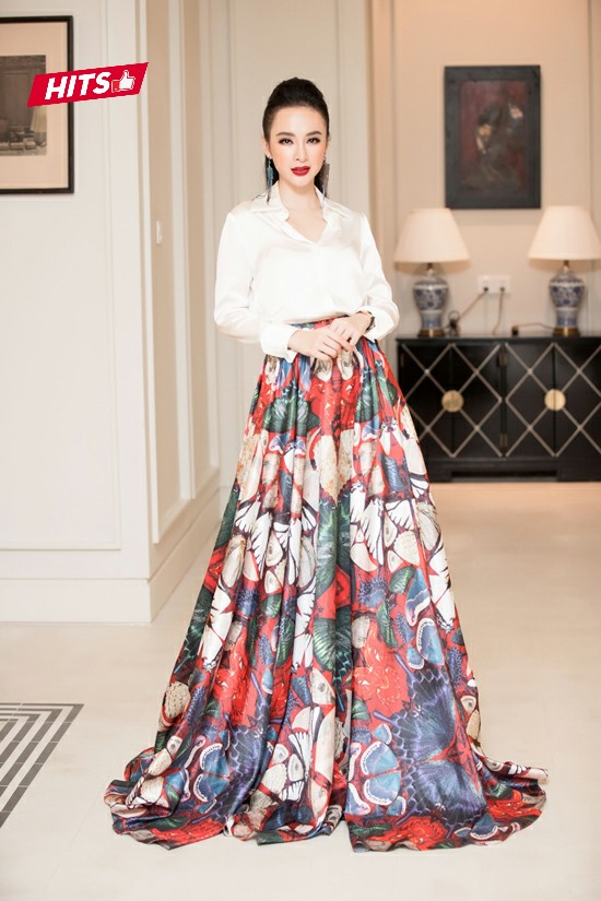 Tham dự một sự kiện tại Đà Nẵng, Angela Phương trinh lựa chọn cách phối trang phục “kín cổng cao tường” gồm sơmi trắng và chân váy dài họa tiết. Tuy không chọn phong cách sexy quen thuộc, thế nhưng phải công nhận, “Bà mẹ nhí” vẫn hoàn toàn lộng lẫy trong set đồ này.