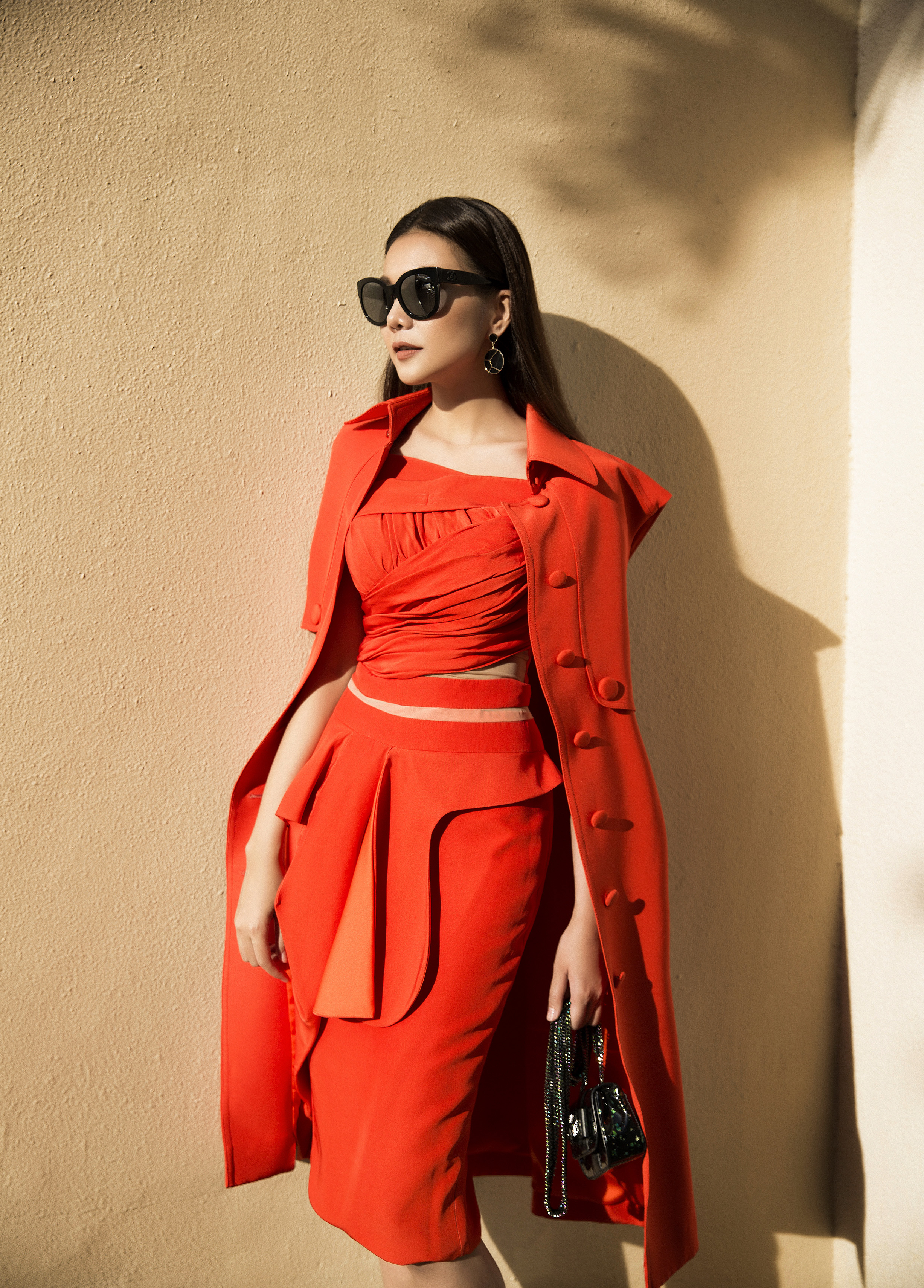 Tông màu cam đỏ cũng là một gam màu yêu thích của Thanh Hằng, bộ váy được cắt may tinh tế với kỹ thuật draping ôm sát cơ thể, giúp cô khoe số đo hình thể. Siêu mẫu cũng khéo léo kết hợp cùng chiếc túi xách nhỏ và mắt kính đen độc đáo để tạo độ tương phản.