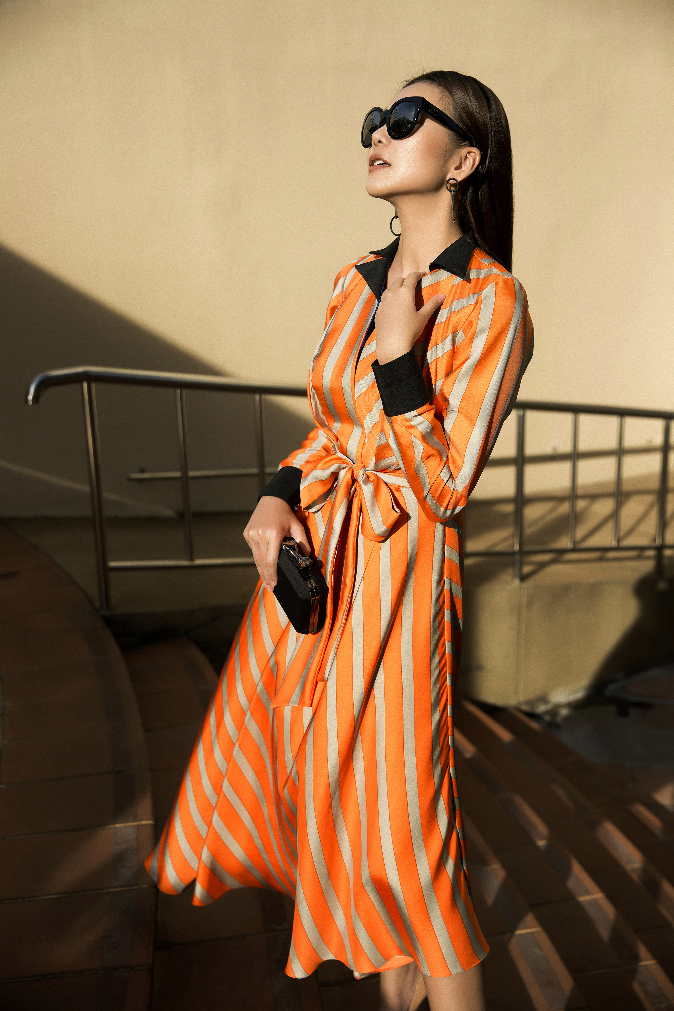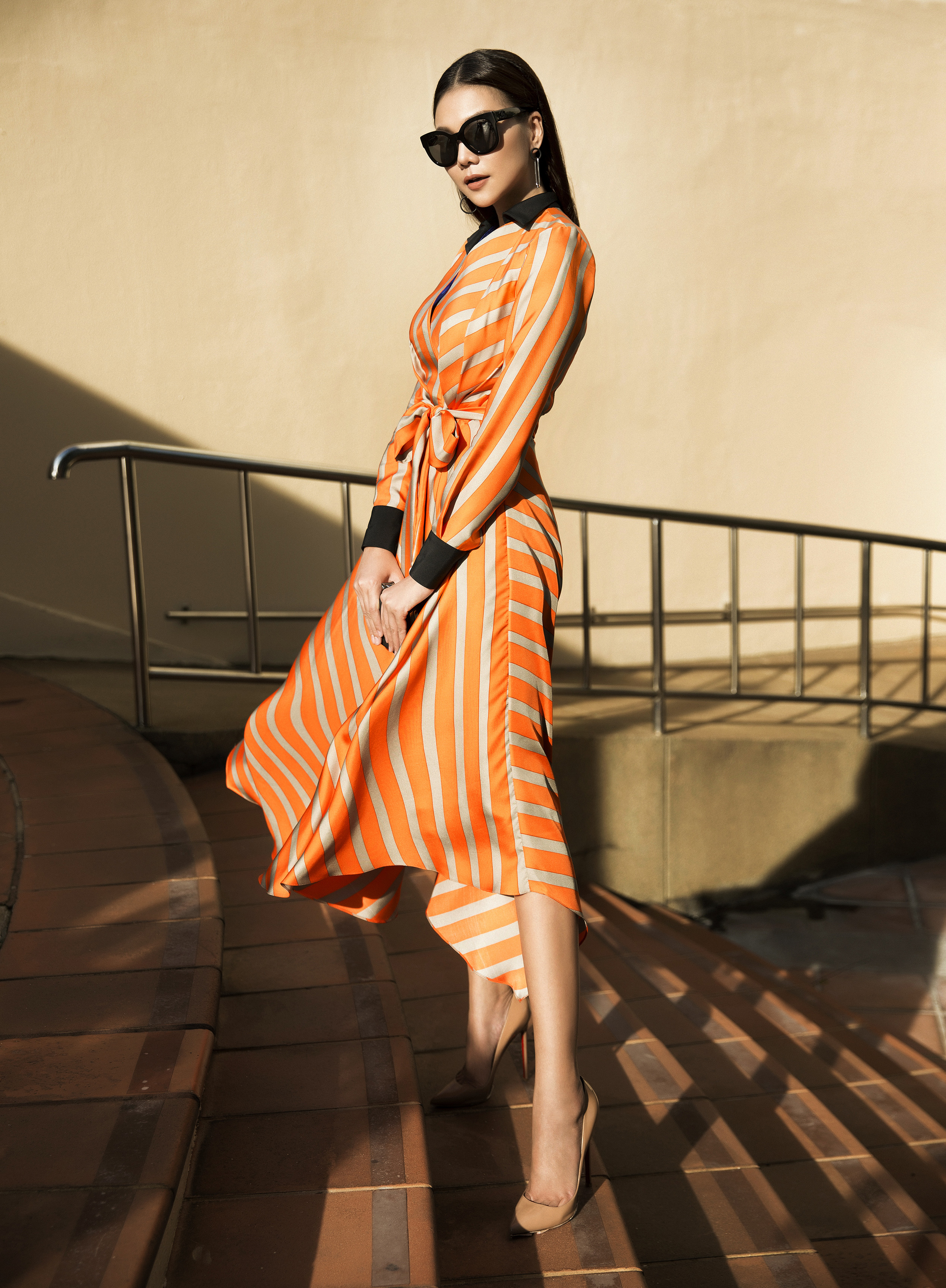Với tông màu sọc cam trẻ trung, Thanh Hằng cũng toát lên nét thanh lịch cùng thần thái sang trọng cố hữu.