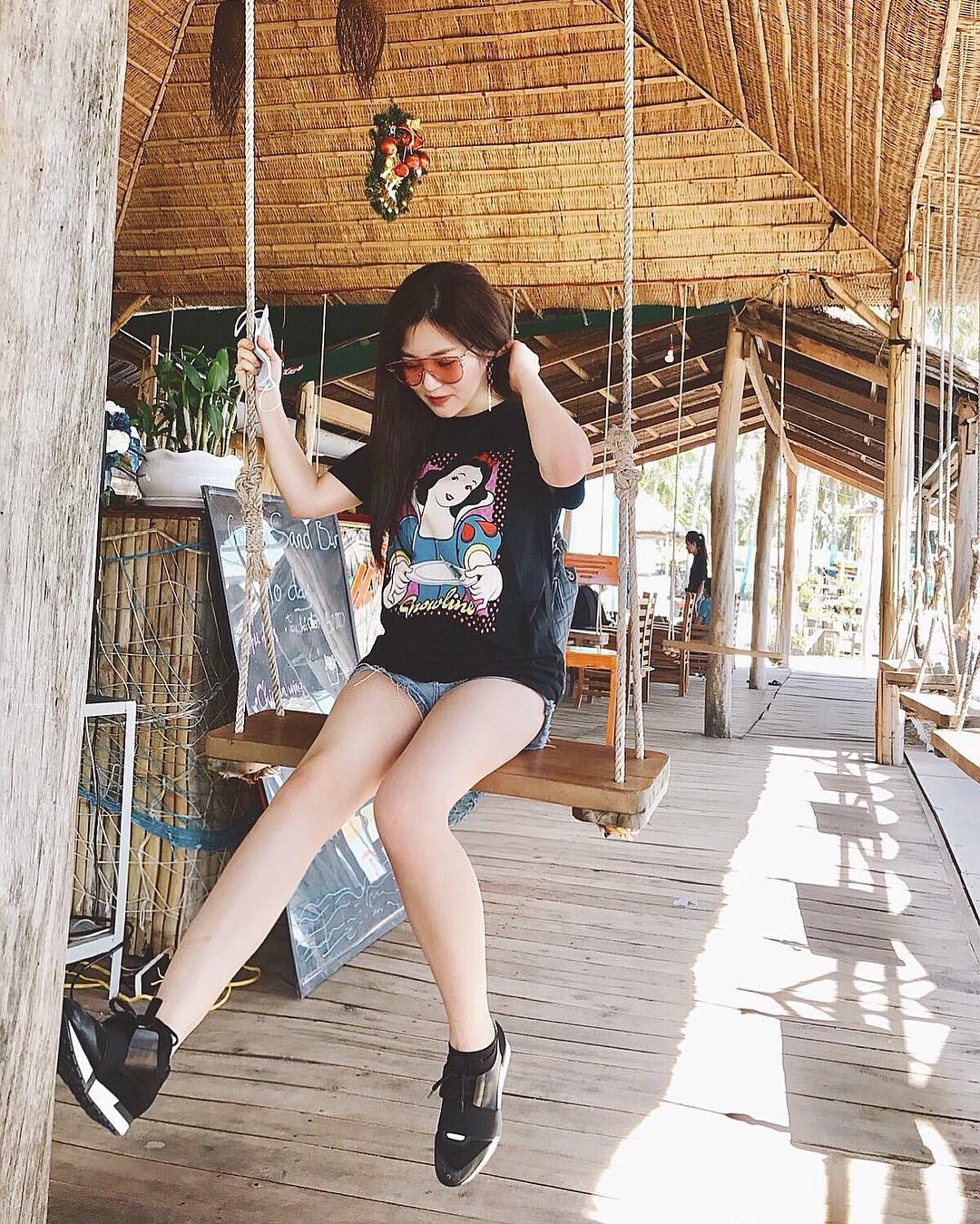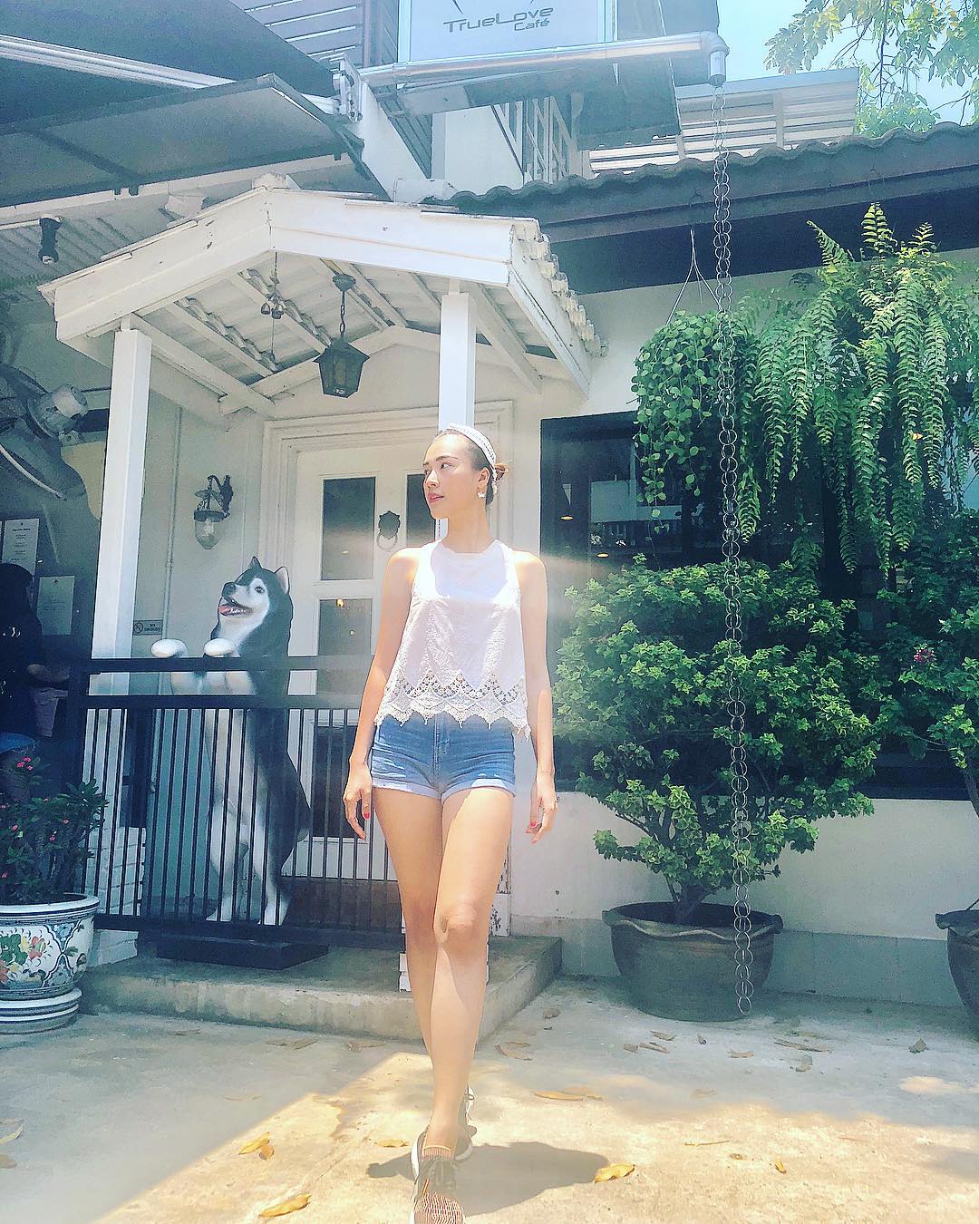 Đôi chân dài cùng làn da trắng của Hoàng Oanh cũng được tôn lên với quần short cạp cao và áo ren mỏng.