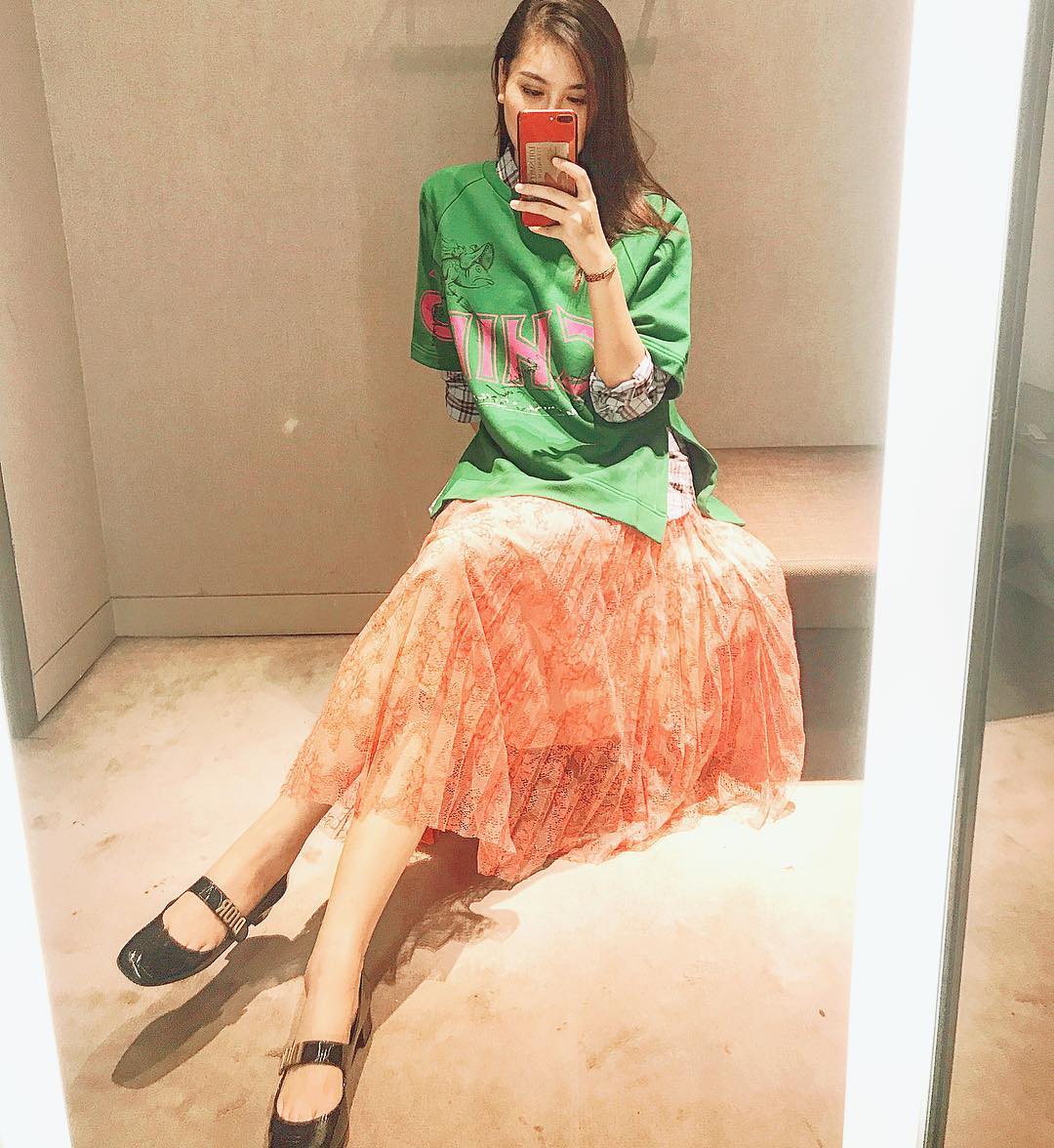 Hà Lade phối chân váy ren hoa dập li cùng áo thun phom rộng, đem lại vẻ ngoài cá tính.