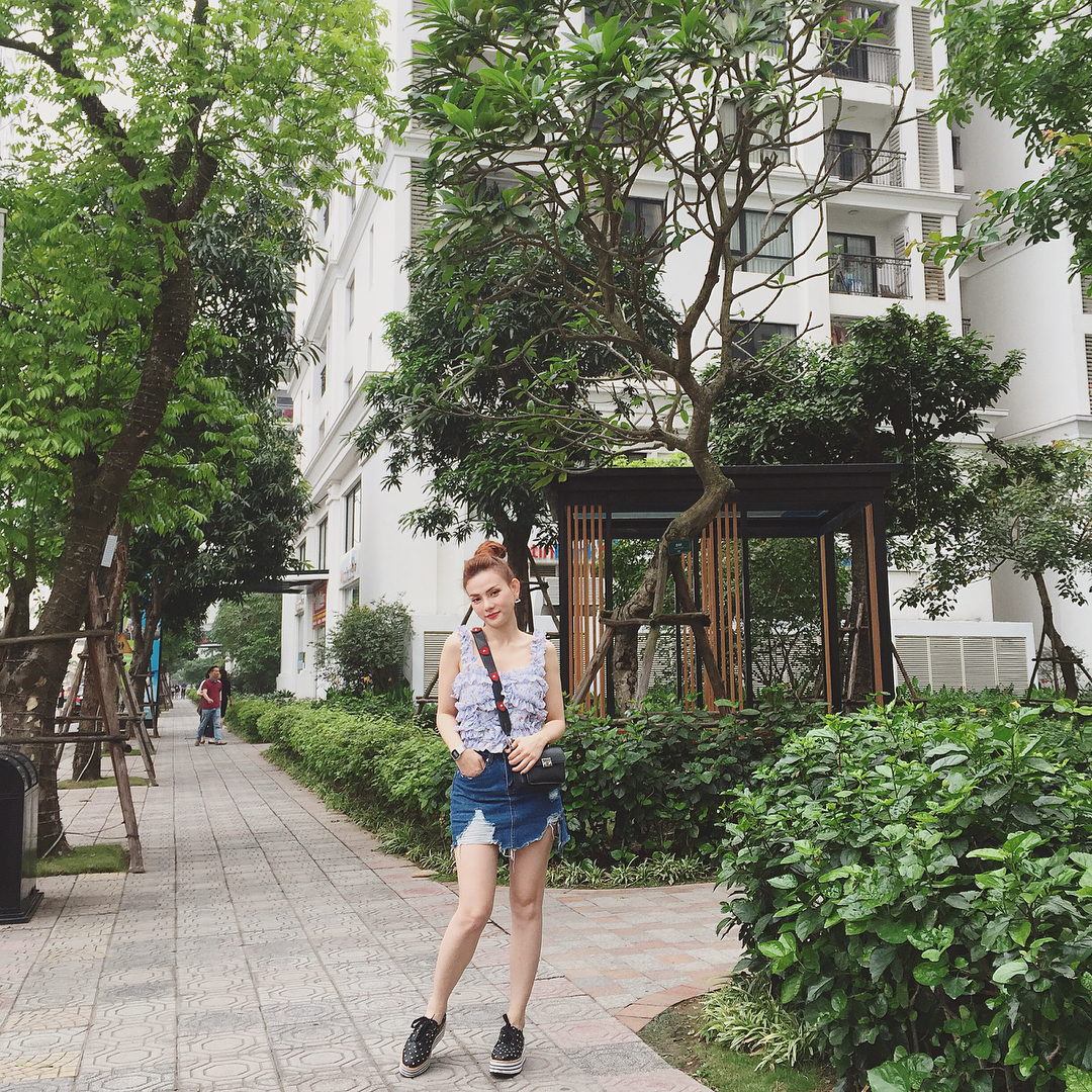 “Mẹ một con” Thu Thủy vô cùng trẻ trung khi xuống phố cùng chân váy jeans wax và áo hai dây dún bèo.