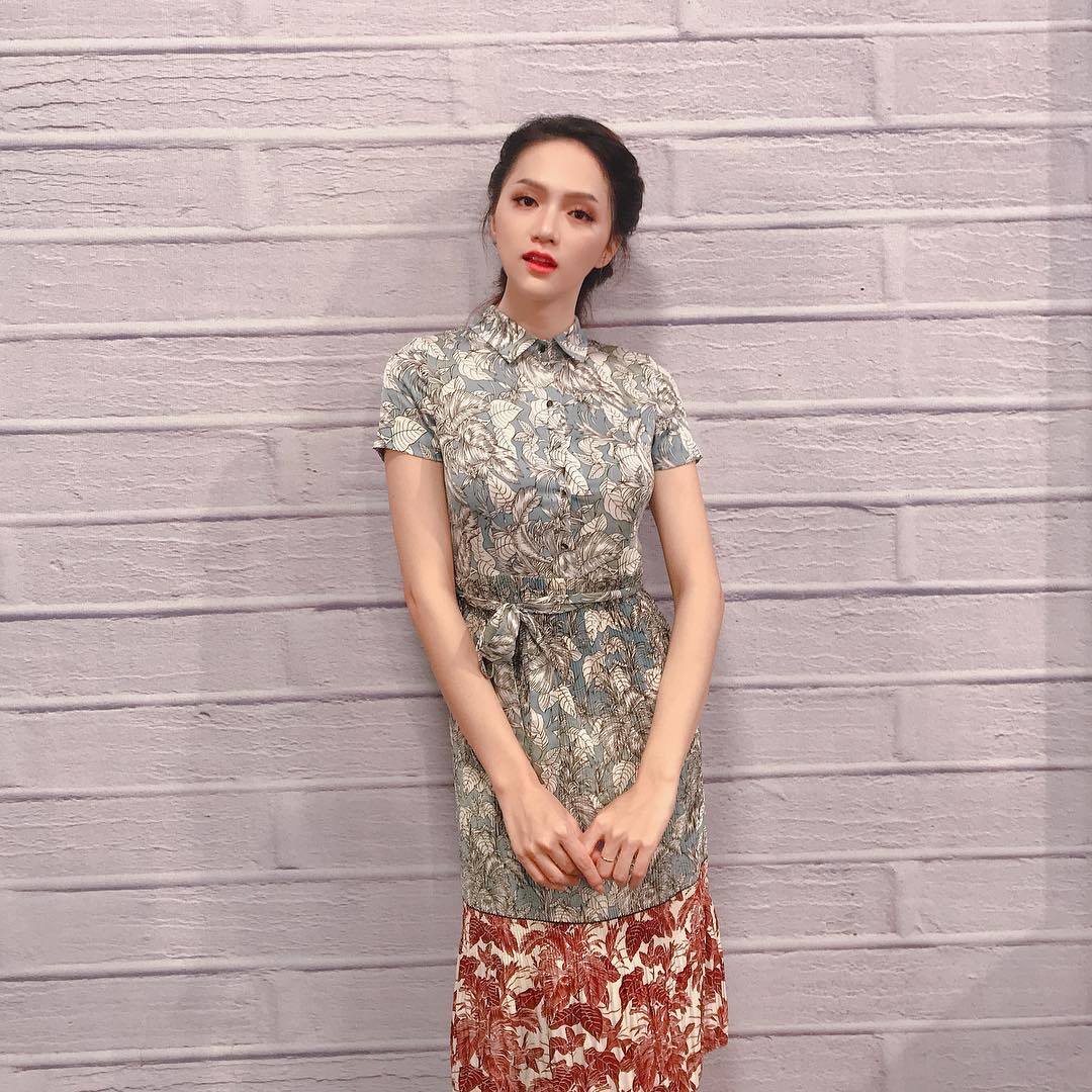 Cùng suy nghĩ diện đầm hoa, song chiếc đầm của Hương Giang Idol lại đem đến cho người mặc vẻ nhã nhặn, kín đáo hơn so với Angela Phương Trinh.