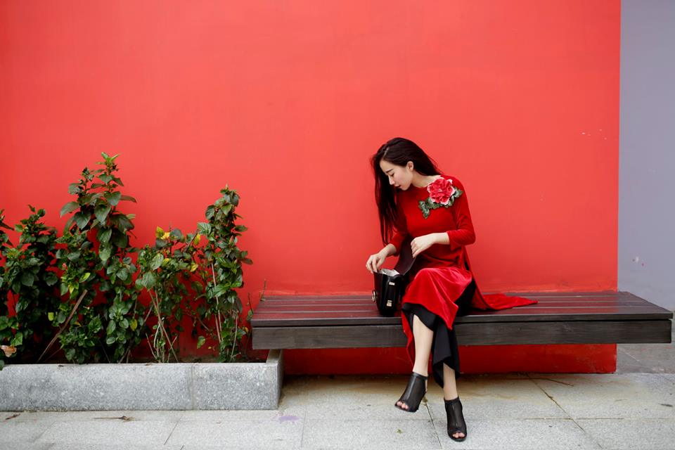 Stylist Đặng Thùy Dương với áo dài đỏ thắm tông xuyệt tông cùng bức tường tạo nên shoot hình ấn tượng ngay từ cái nhìn đầu tiên.