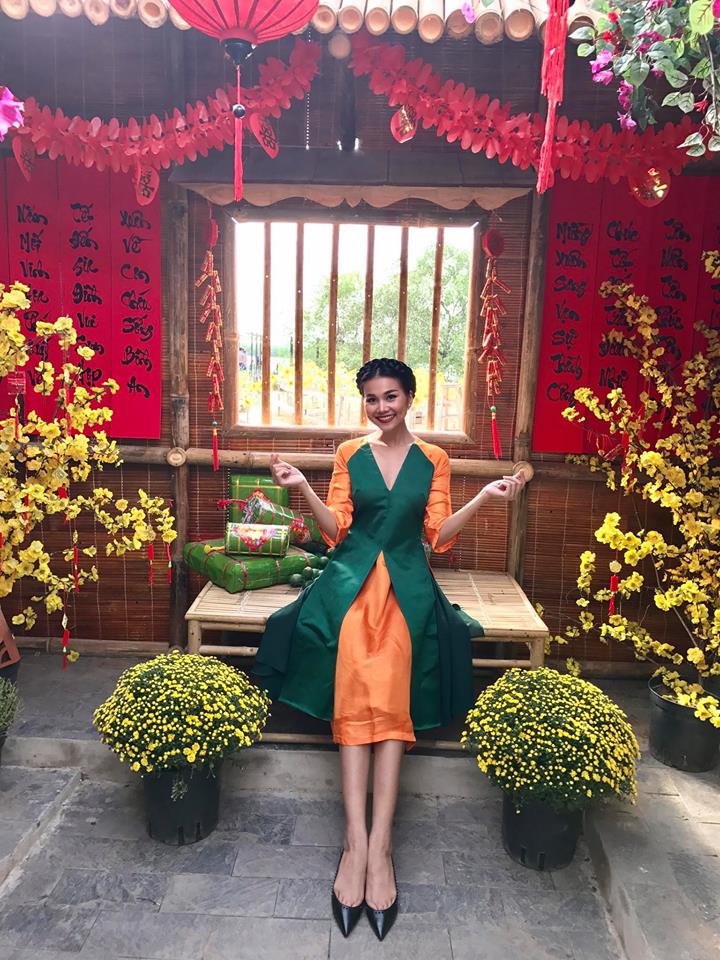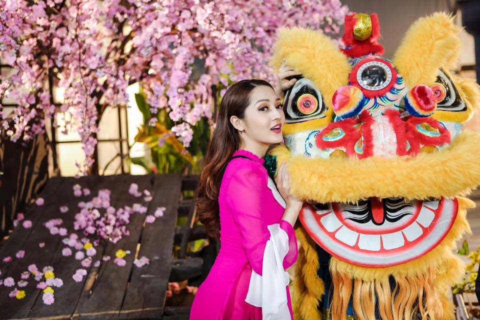 Thanh Hằng xinh đẹp với background chụp hình Tết rực rỡ.