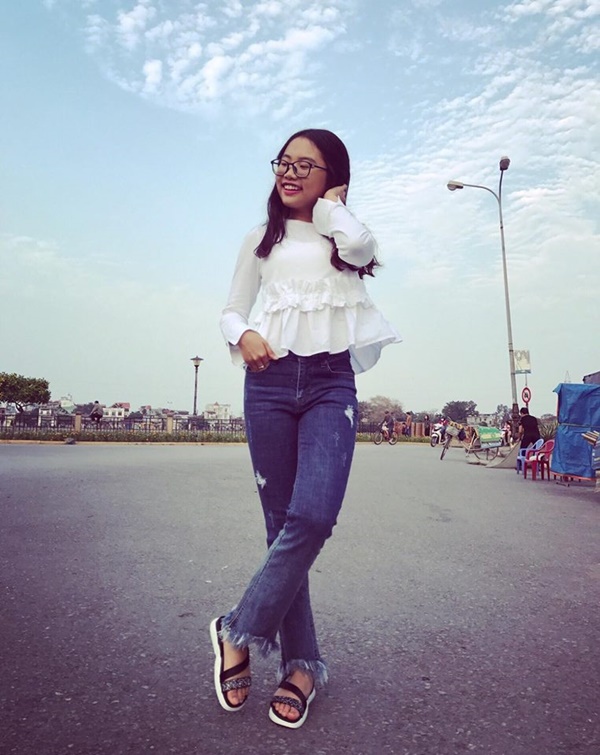 Hiện đại với áo sơ mi trắng và quần jeans ống loe tua rua - items được các tín đồ thời trang lăng xê nhiều và cô bé cũng nhanh tay ứng dụng để có bức hình street style rất trendy.