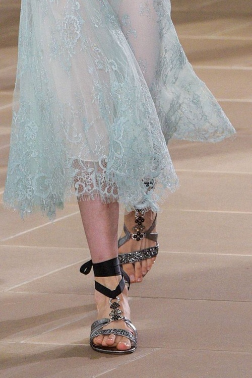 Monique Lhuillier với đôi sandals đính đá và phần buộc dây nhỏ nhắn ngay cổ chân. Đôi giày như thế này luôn là lựa chọn phù hợp với những bộ váy áo thướt tha.