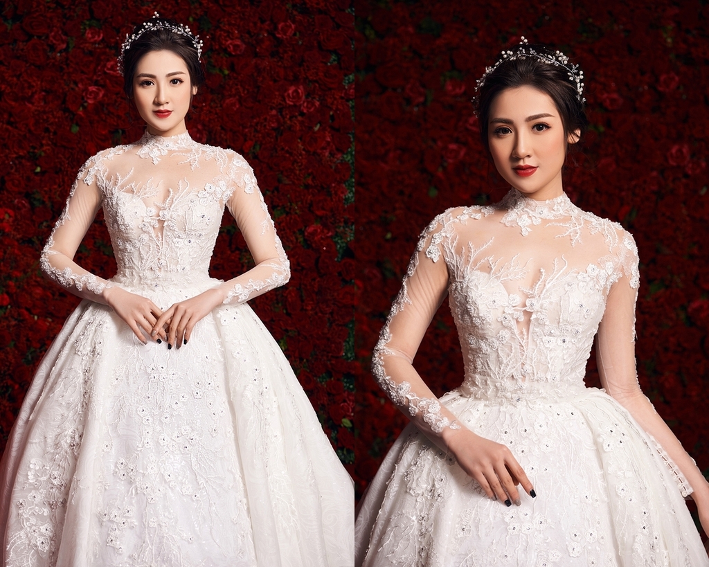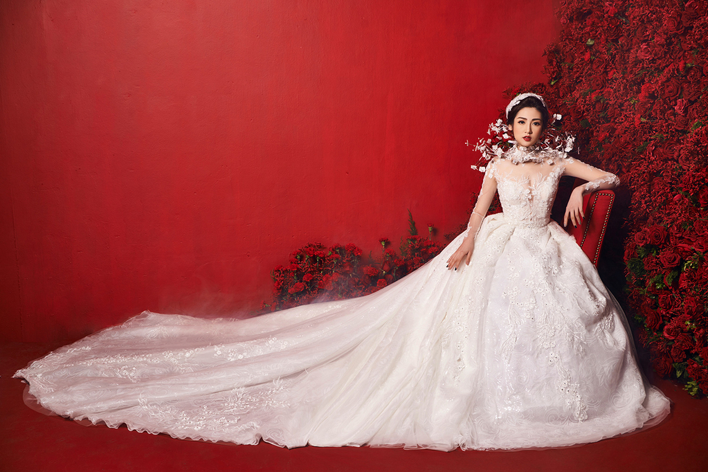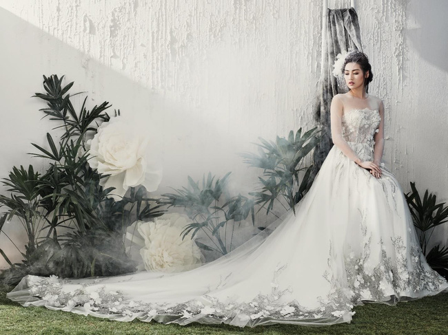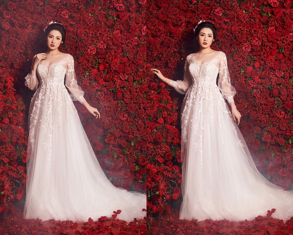 Sự yêu kiều và tha thướt của chân dài Hà thành luôn là nét cuốn hút ánh nhìn của người khác giới. Một bộ váy cưới đuôi dài trở nên lộng lẫy vô cùng được cô diện trong bộ ảnh năm ngoái.