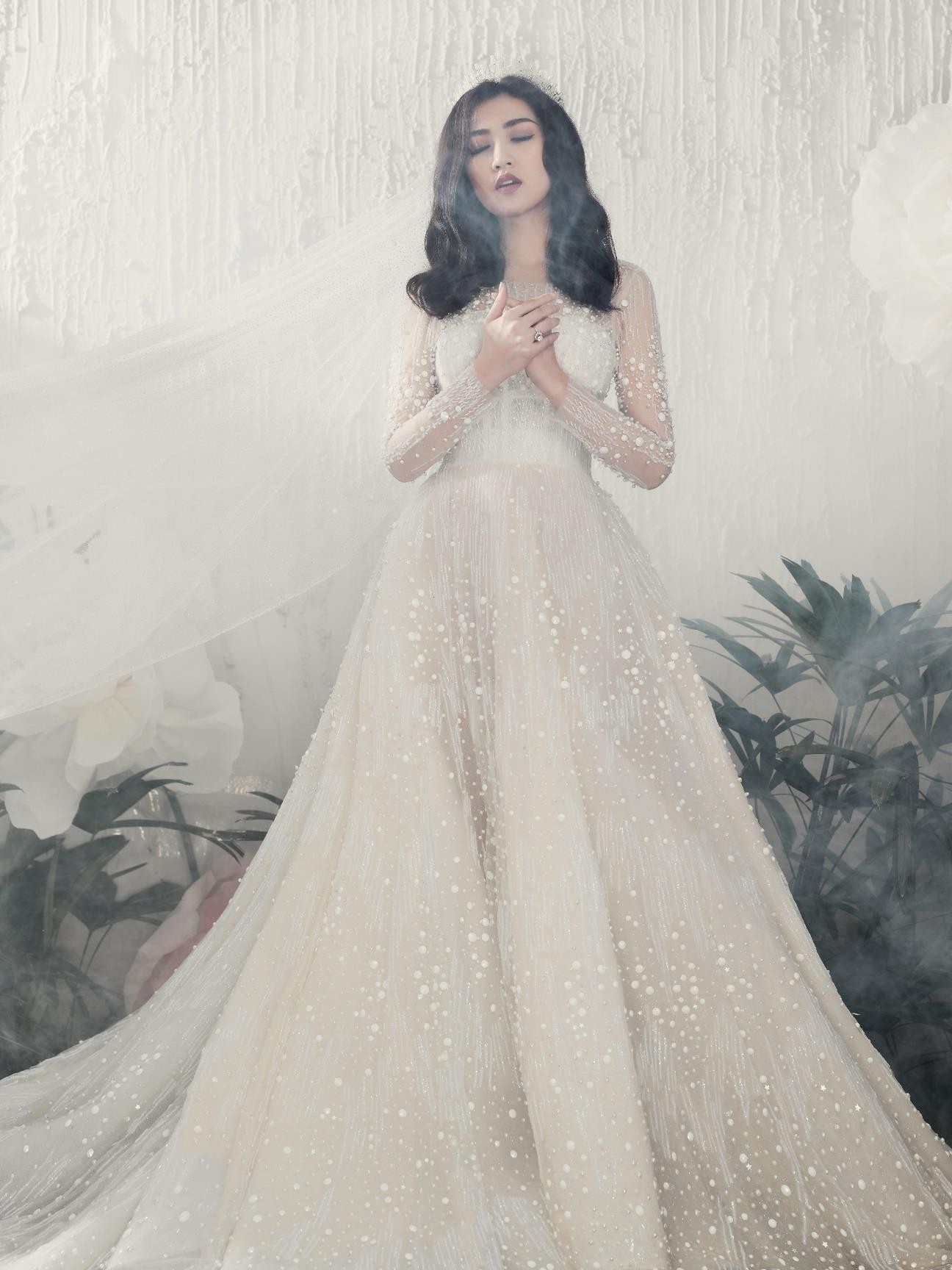 Đây là chiếc váy được đính hàng ngàn viên ngọc trai và pha lê Swarovski trên nền vải metallic mang lại cho cô dâu Tú Anh một dáng vẻ nữ tính và lộng lẫy đến không ngờ.