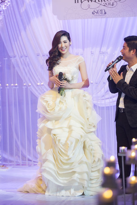 Nhờ gương mặt đẹp, Á hậu Tú Anh thường được các nhà thiết kế áo cưới trong nước yêu thích gửi gắm cô trình diễn những mẫu thiết kế mới nhất. Vì thế Tú Anh được dịp diện áo cưới thỏa thích. Chiếc váy cưới đặc biệt này gắn 20 kim cương cắt bằng lưỡi dao công nghệ đỉnh cao biến hóa nàng hậu thành một cô công chúa thứ thiệt.