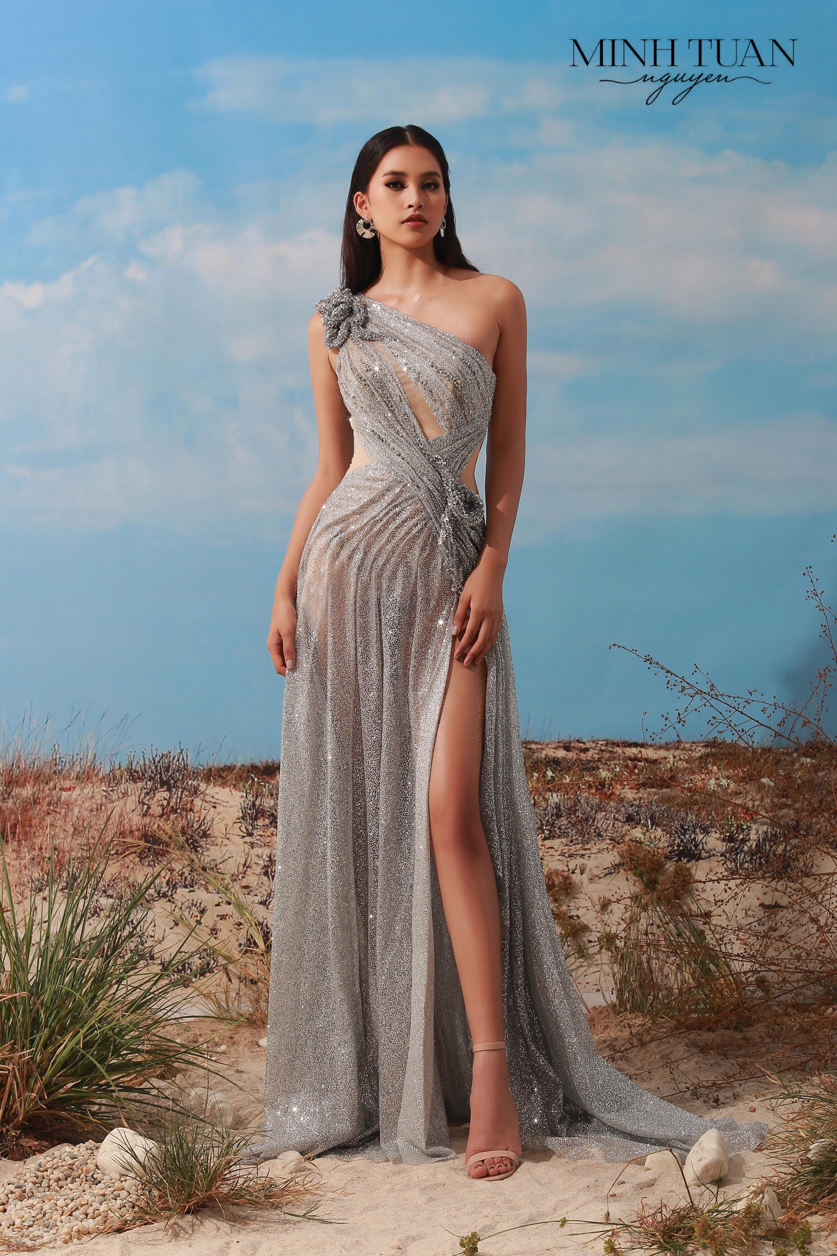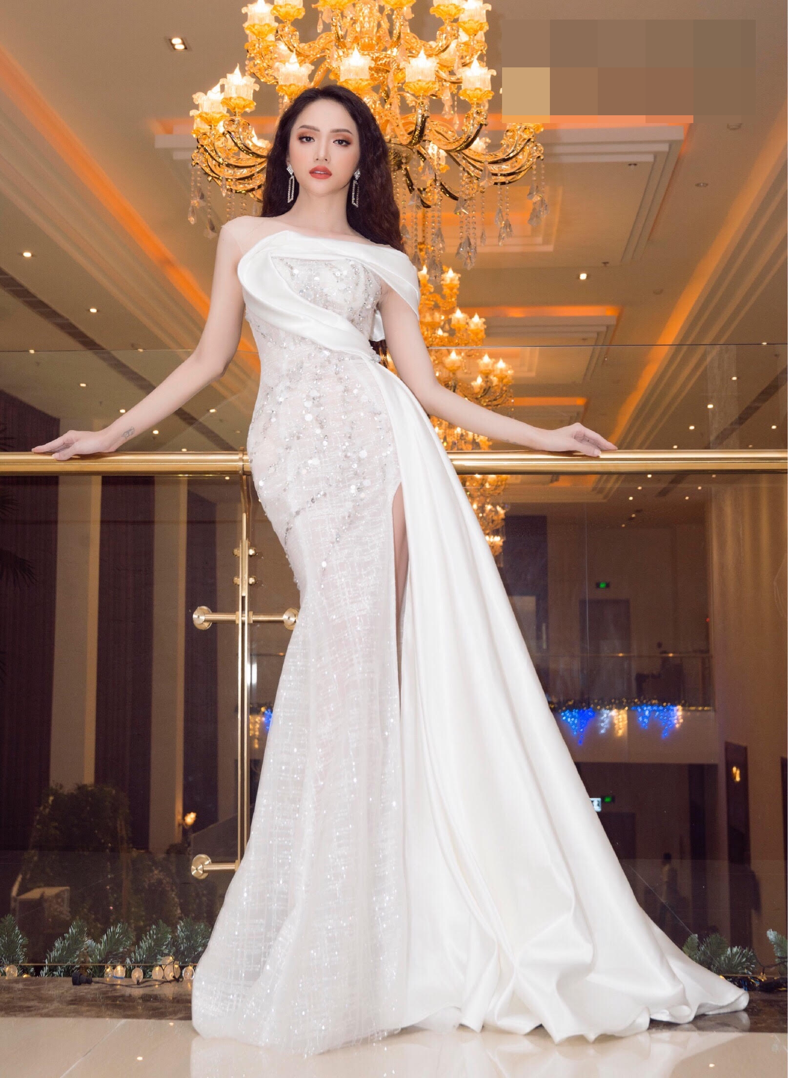 Đây là một thiết kế của Ntk Nguyễn Minh Tuấn từng được Hương Giang chưng diện, chiếc đầm có đường vắt cong đổ từ tay qua ngực và phần eo khéo tôn lên đường cong người mặc.