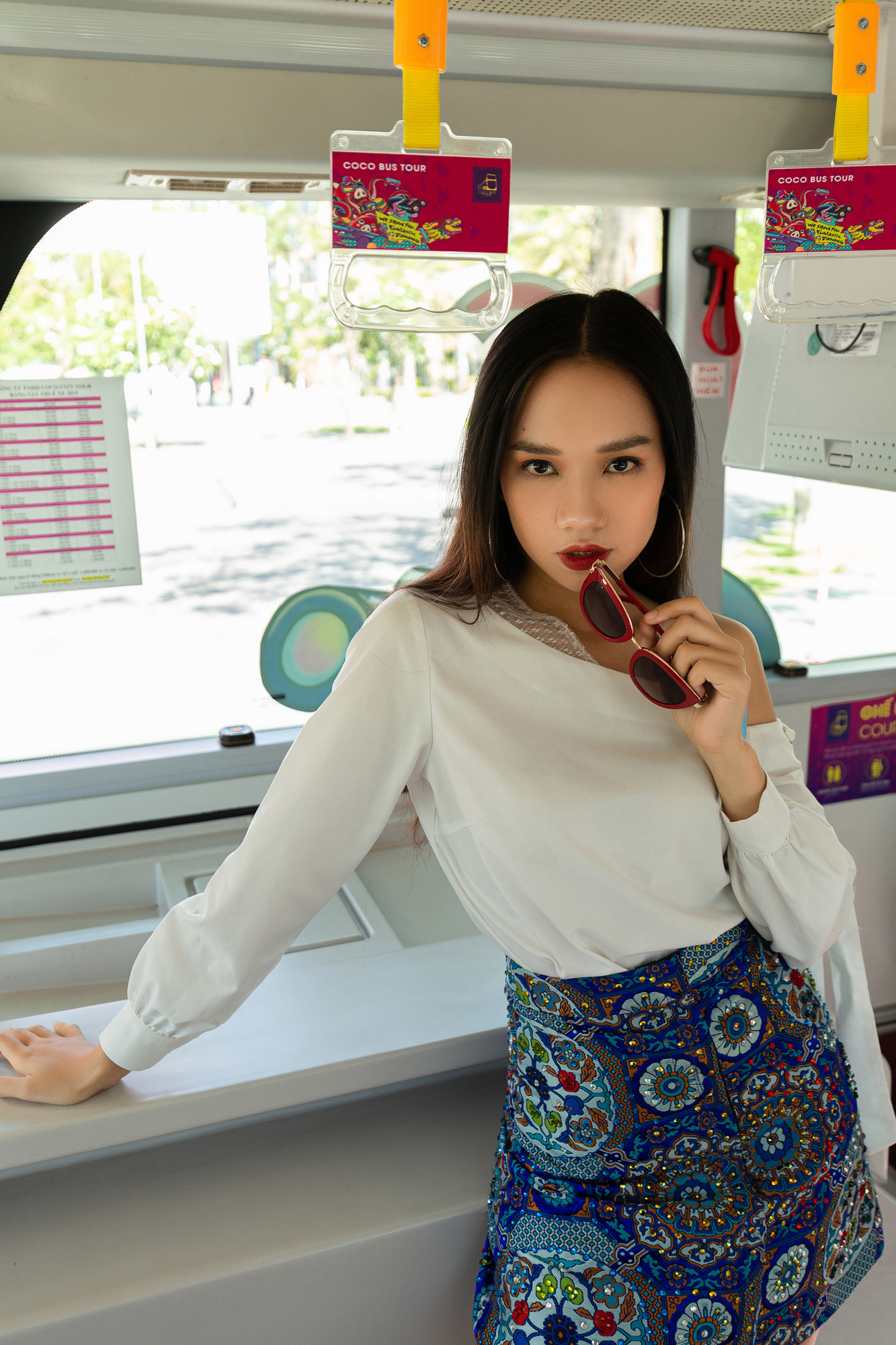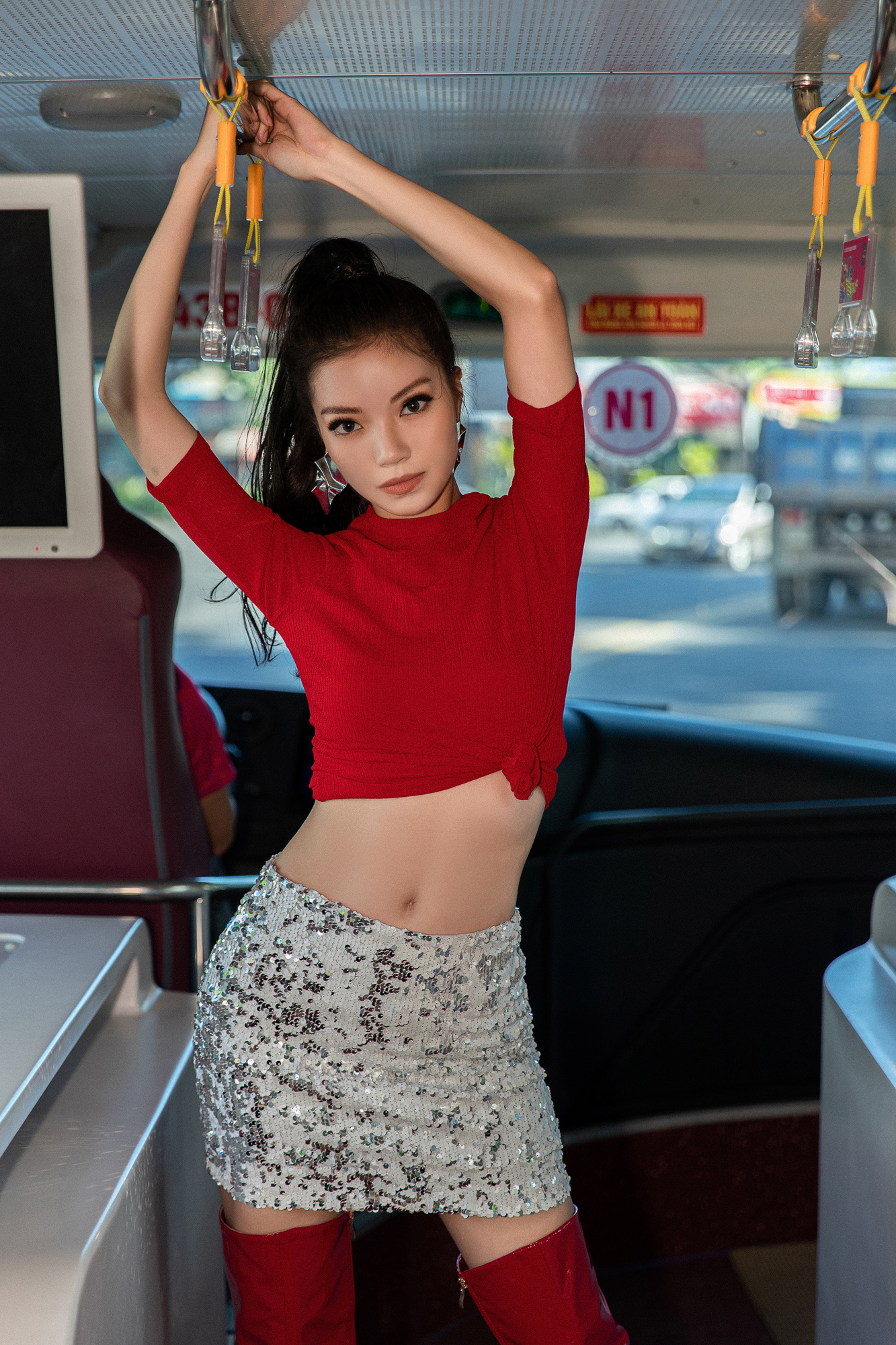 Tận dụng mọi ngóc ngách trên bus, các cô nàng thỏa sức posing