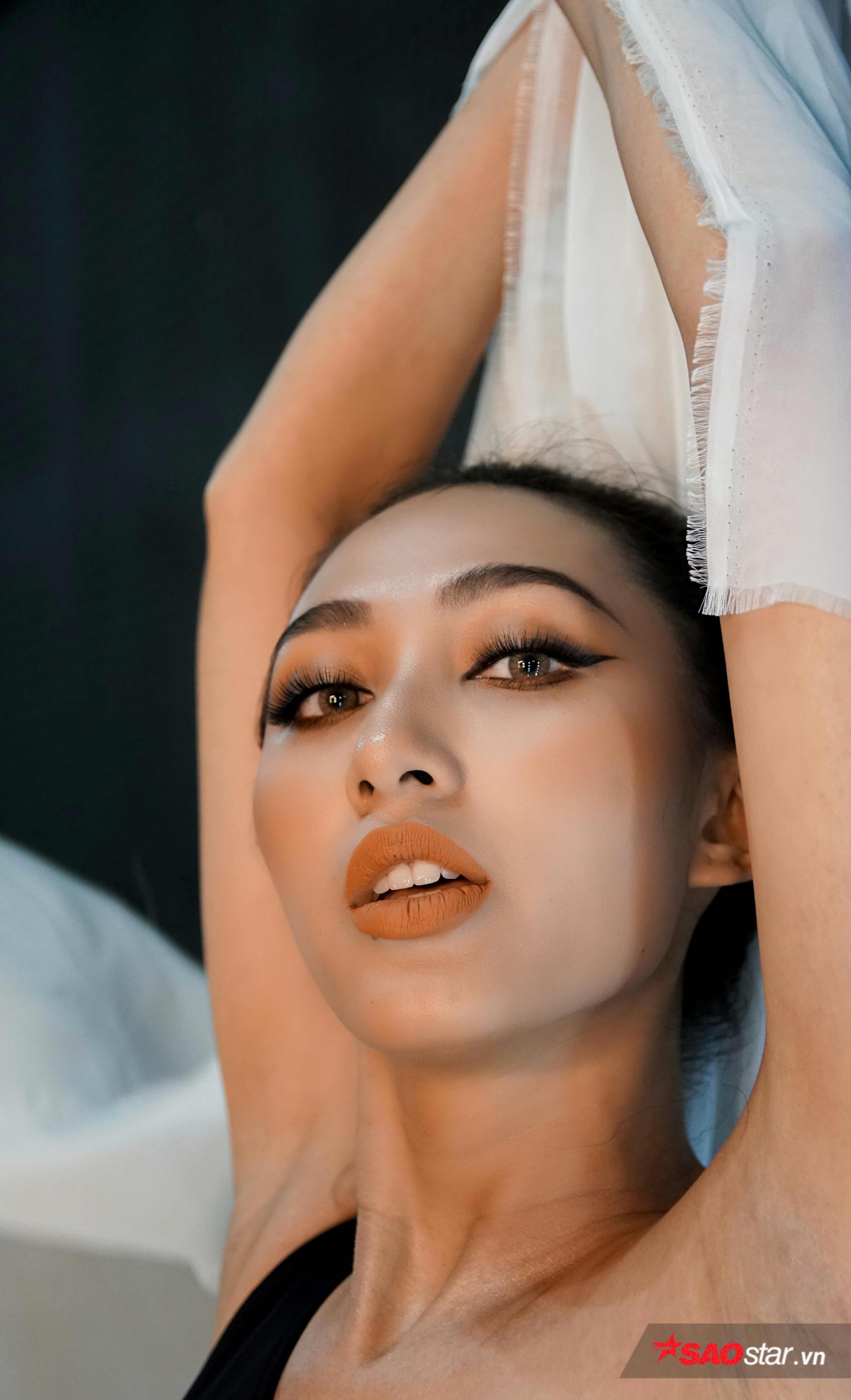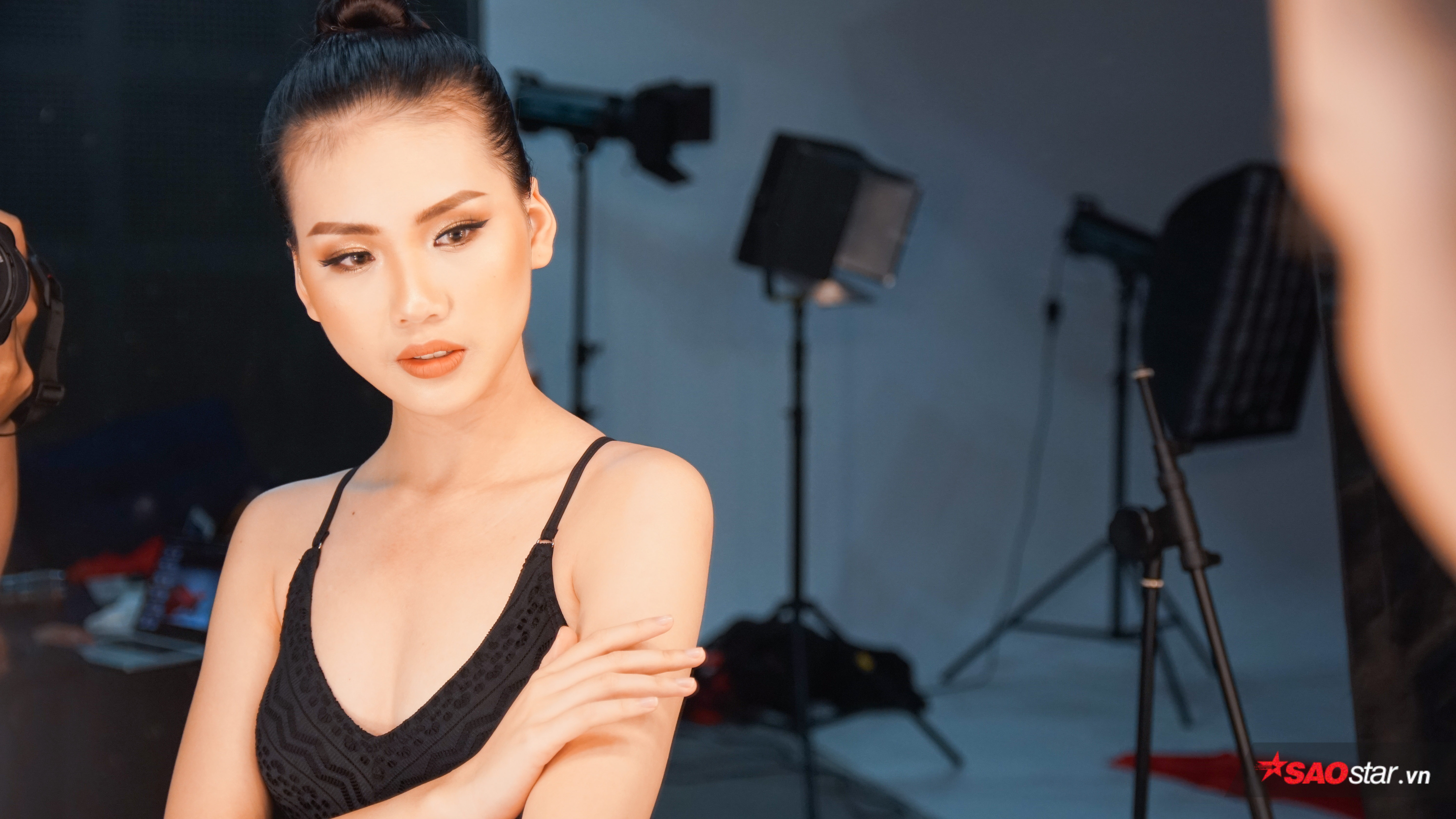 Quỳnh Hoa tập luyện ánh mắt, thần thái trước khi bước vào set chụp.