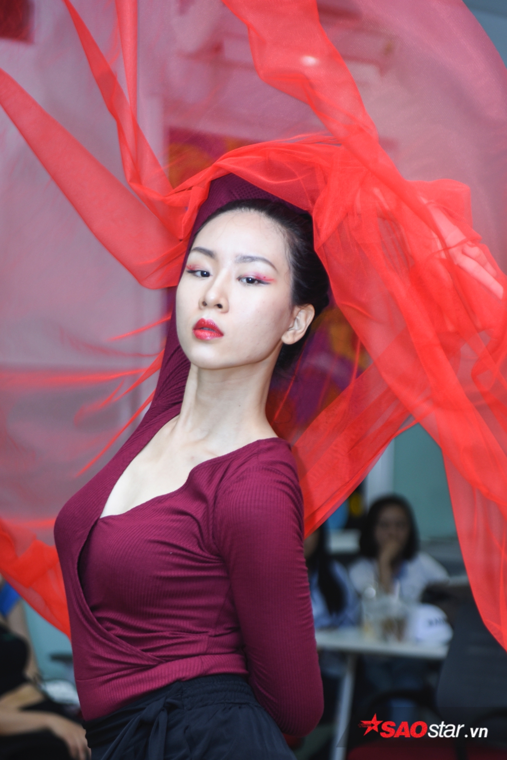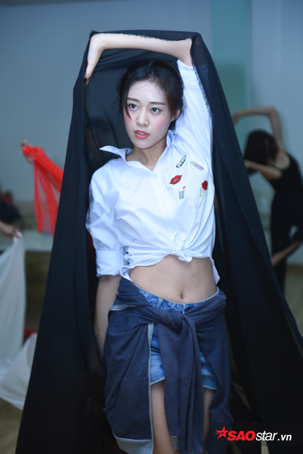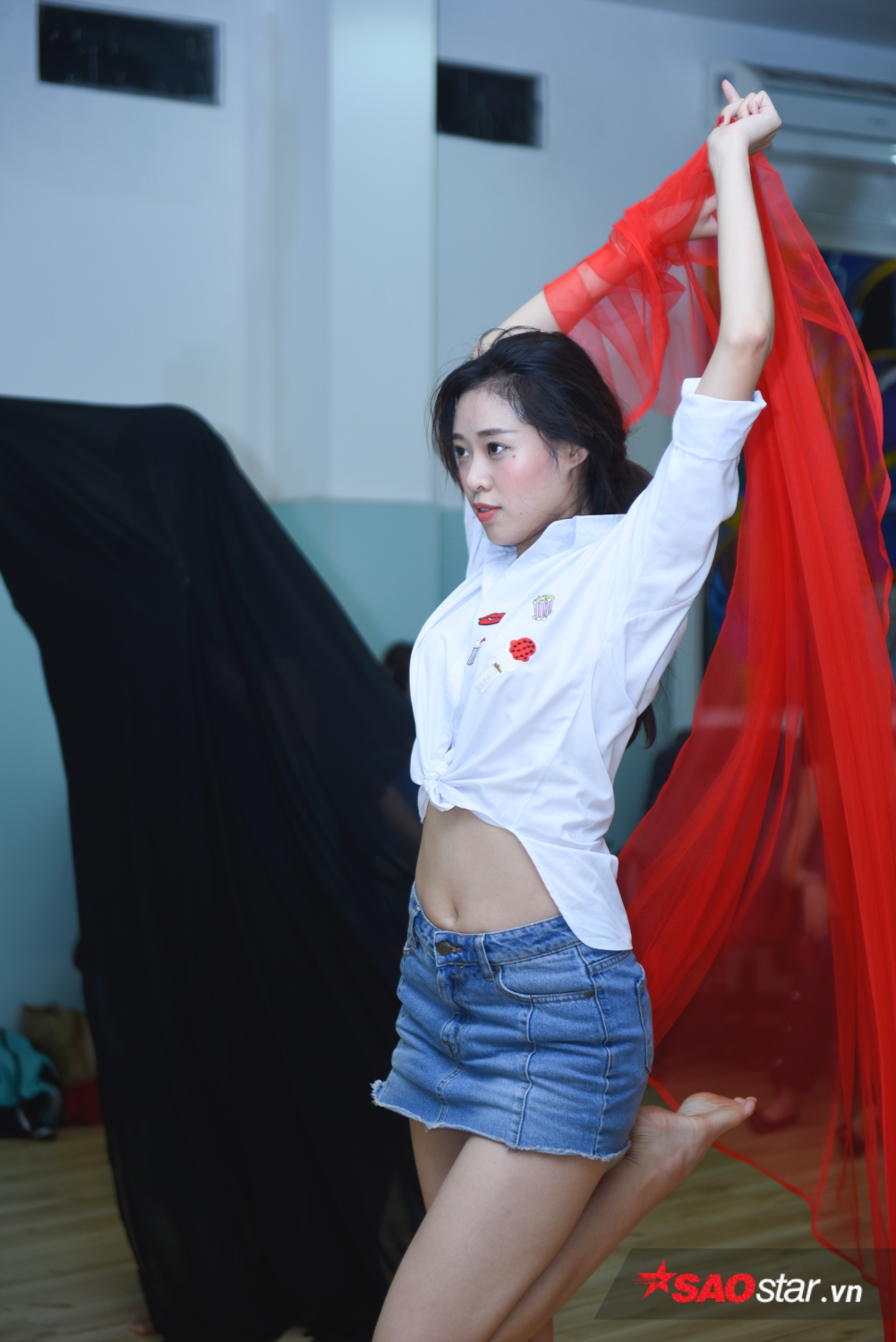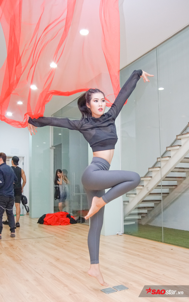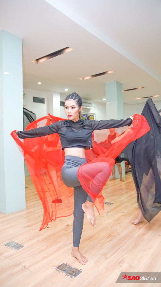 Sau những động tác giải phóng hình thể, các thí sinh bắt đầu bước vào buổi tập luyện tạo dáng, tương tác với đạo cụ là một tấm lụa.