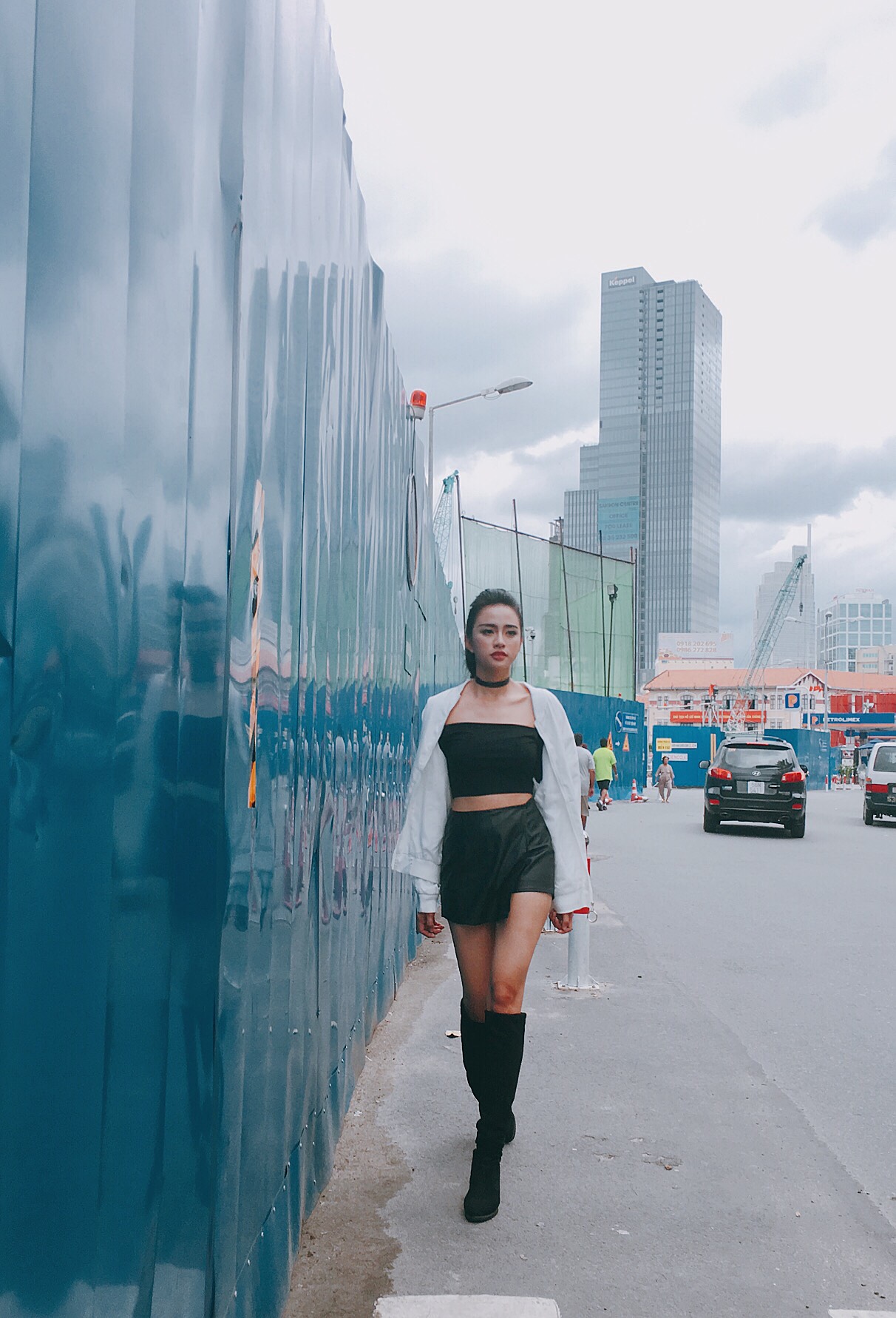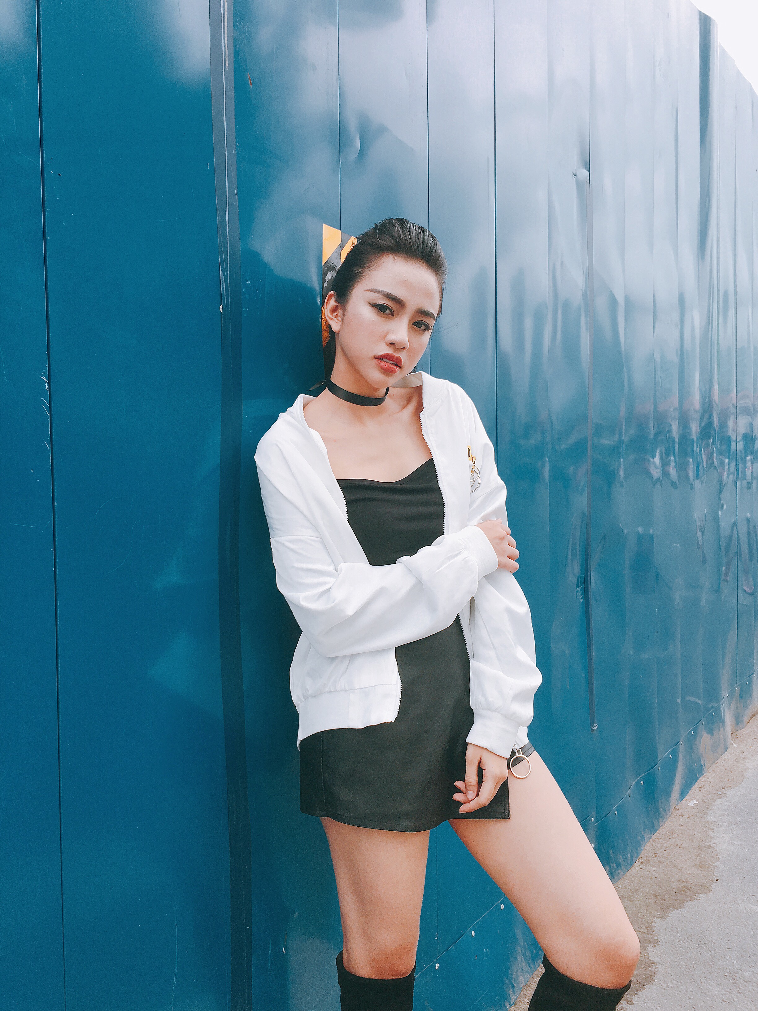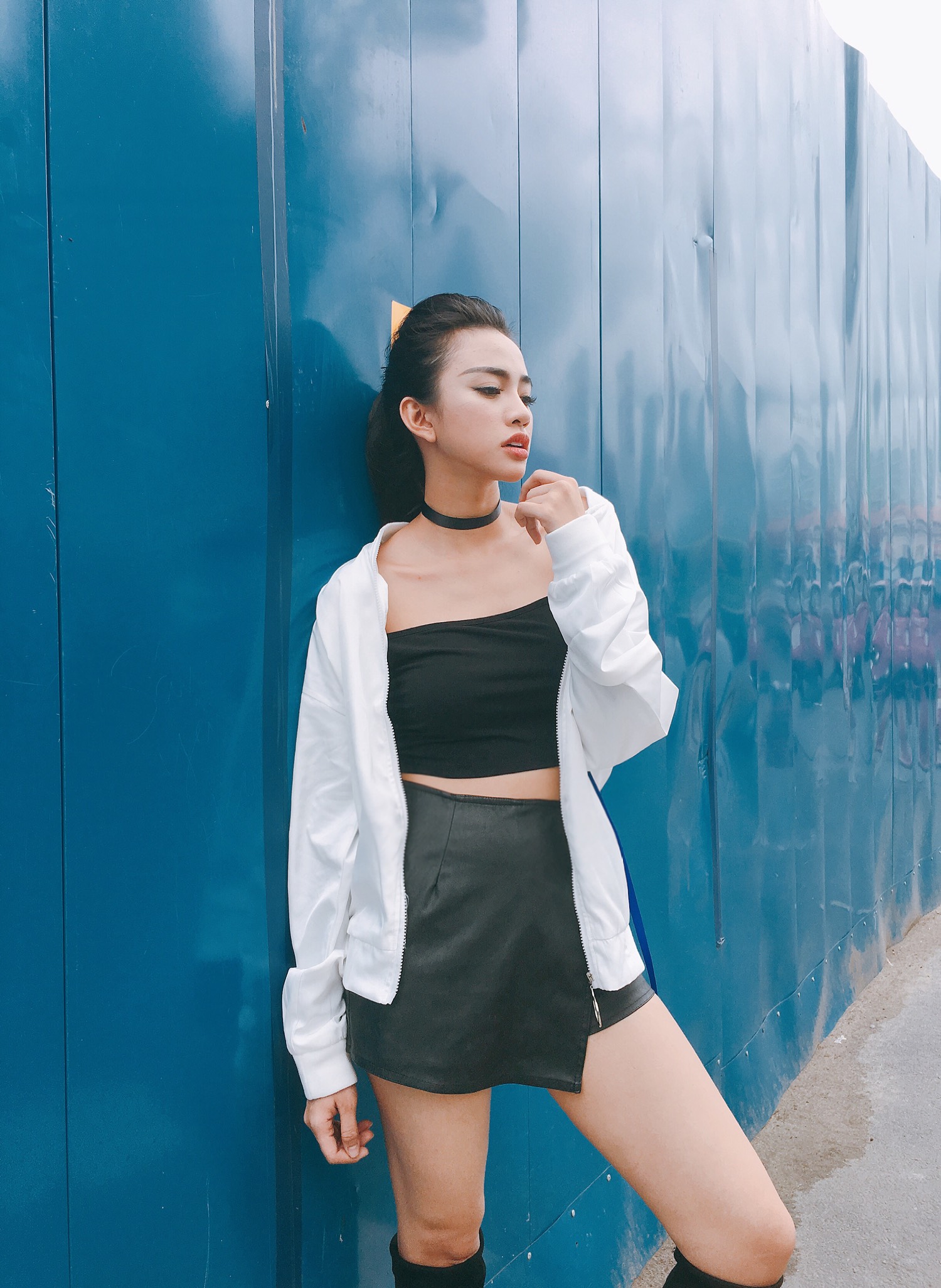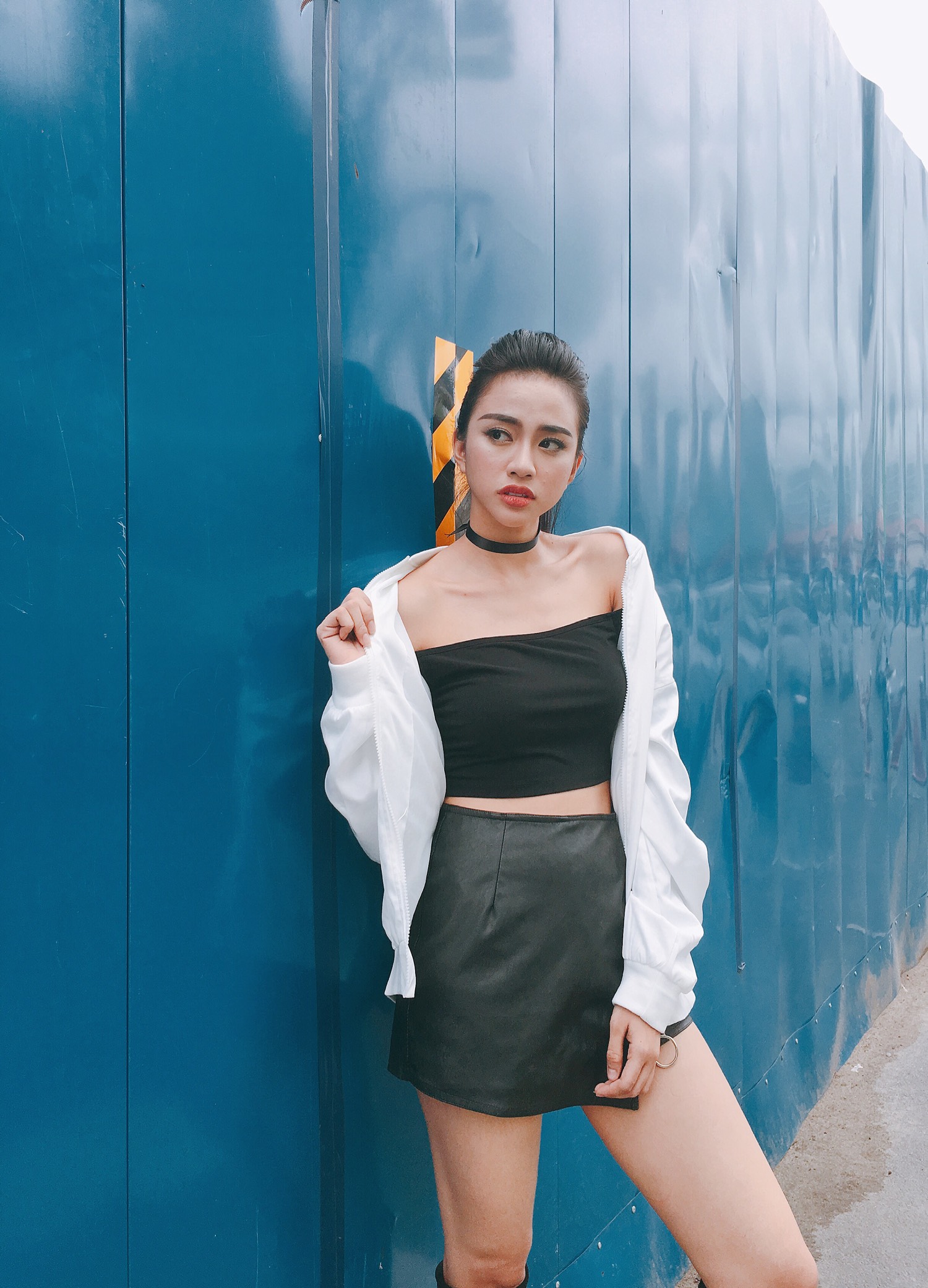 Những món đồ mà Thiên Nga chọn hầu hết đều vô cùng quen thuộc với các nàng: áo quây bên trong khoác bomber, chân váy da và vòng cổ chocker.