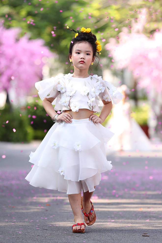 Mẫu nhí Tuệ Lâm với thiết kế crop và chân váy trắng đính hoa rơi nhẹ nhàng.
