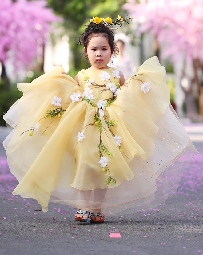 Hà Vy trình diễn chiếc váy vàng công chúa đính hoạ tiết hoa anh đào .