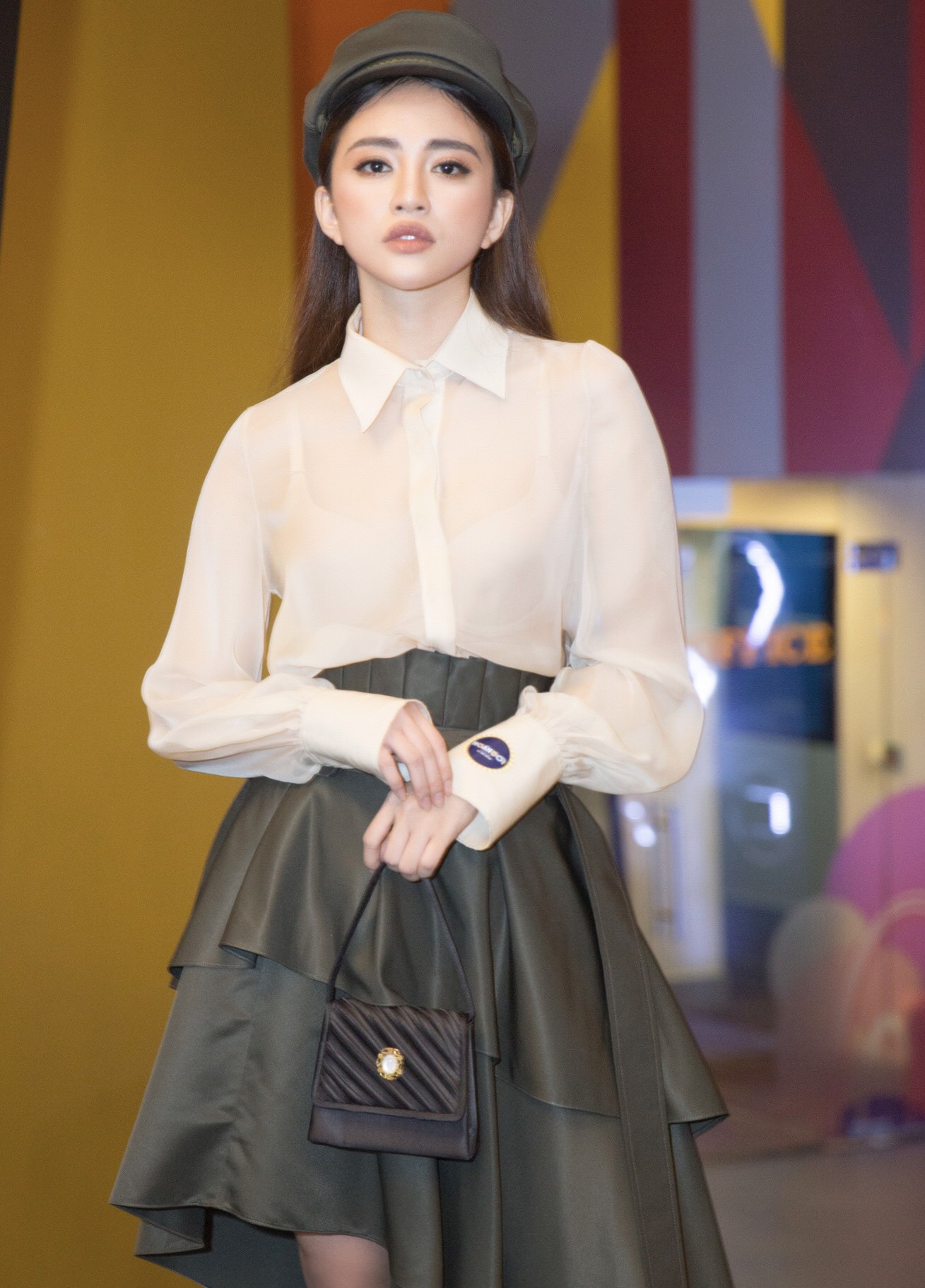 Cô nàng xinh đẹp Thiên Nga xuất hiện tại một sự kiện với một phong cách thời trang Thu - Đông hơi hướng cổ điển, sang trọng và ngọt ngào. Nàng mẫu chọn cho mình chiếc mũ bán báo làm điểm nhấn nổi bật với cách phối đồ đầy mới mẻ như áo sơ mi trắng rũ tay bèo phối với chiếc váy đen màu xám tro được thiết kế xếp tầng cùng với đôi boots cổ ngắn.