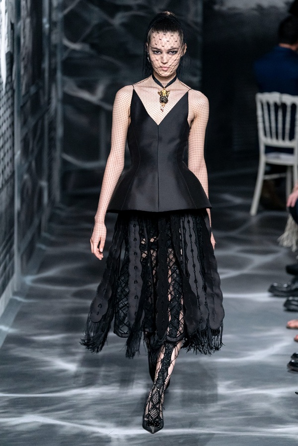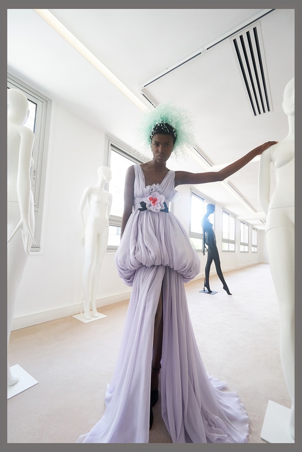 Thiết kế nguyên bản thuộc BST Haute Couture Thu Đông 2019 với phần bèo nhún và bông hoa ở giữa eo