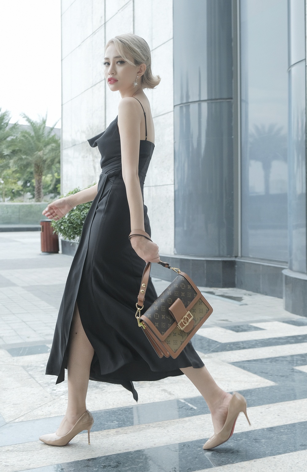 Gợi ý cuối cùng mang lại sự sang chảnh và gợi cảm là một chiếc váy 2 dây cách tân tà váy điệu đà. Với outfit này, Thiên Nga chọn điểm nhấn bằng túi xách hàng hiệu Louis Vuitton dòng Dauphine họa tiết monogram kinh điển trong BST Xuân Hè 2019.