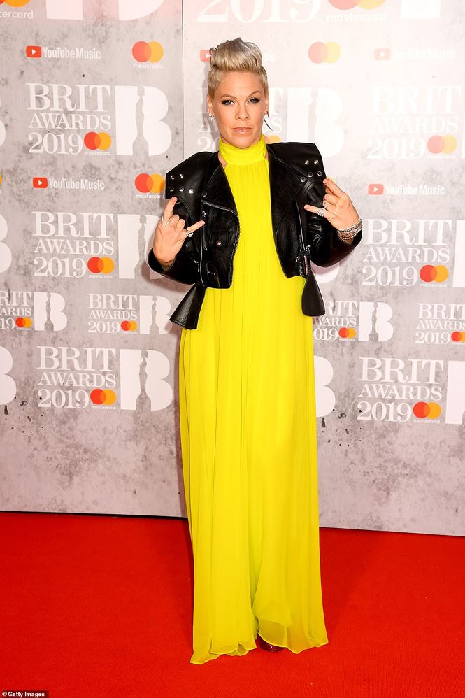 Cô ca sĩ Pink nữ tính trong chiếc váy vàng neon cùng chiếc áo khoác da bên ngoài