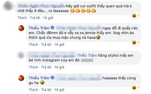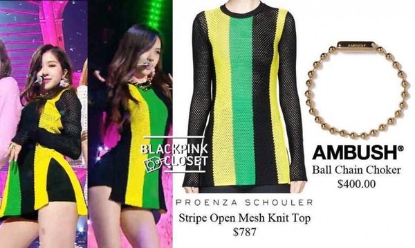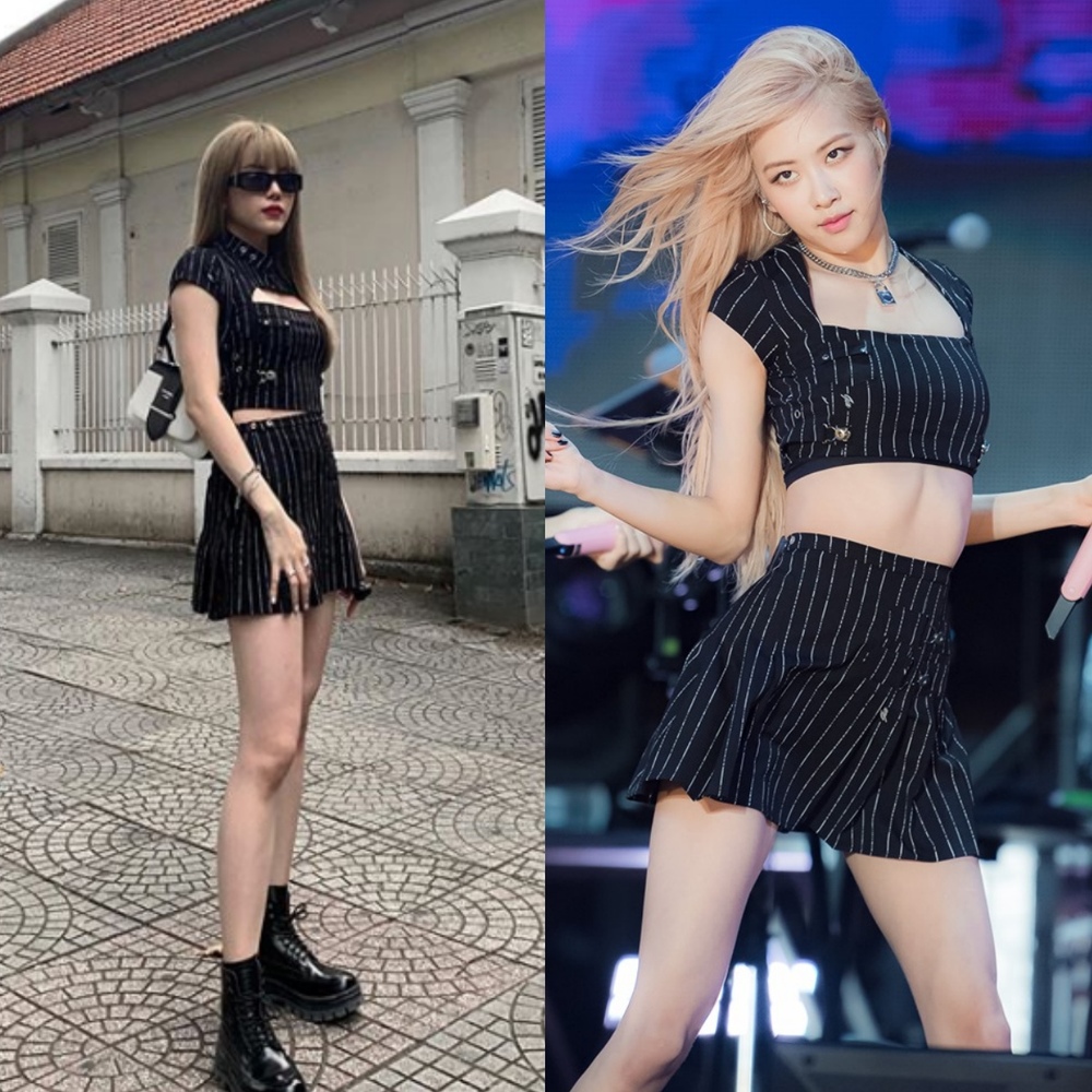 Thiều Bảo Trâm còn chứng minh “tâm linh tương thông” với thần tượng khi lên đồ trước cả Rosé. Set váy áo kẻ sọc của I.AM.GIA trị giá 150 USD (xấp xỉ 3,5 triệu đồng) được Thiều Bảo Trâm chụp ảnh street style vào tháng 7 còn Rosé diện trong sự kiện âm nhạc gần đây. Cả hai đều trông xinh đẹp, ấn tượng với outfit này. Tuy nhiên, stylist của Black Pink đã sáng tạo khi cắt phần cổ áo từ hình bán nguyệt thành hình vuông, giúp Rosé khoe xương quai xanh quyến rũ.