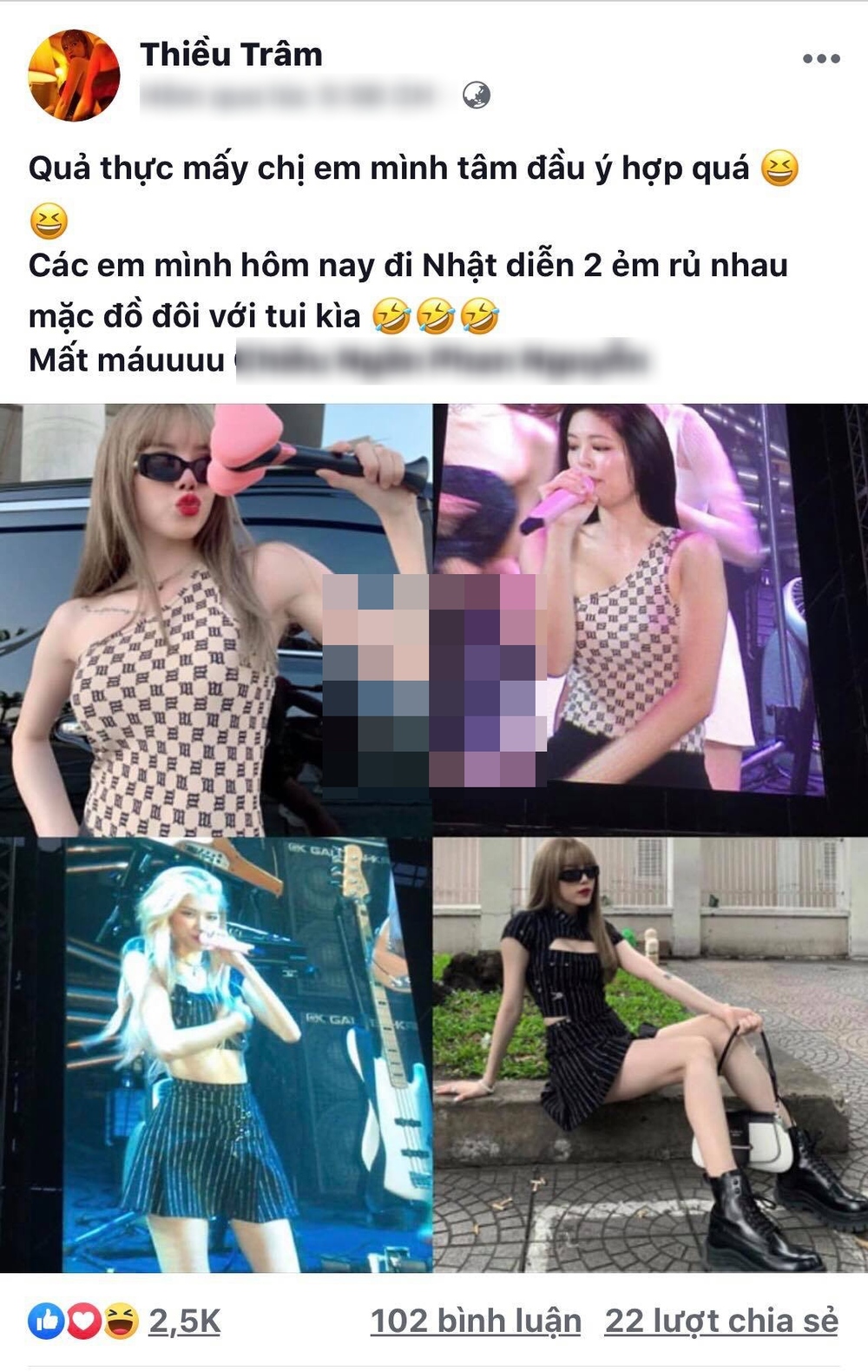 Nhận ra vụ “đụng hàng” ngẫu nhiên, nữ ca sĩ Việt phấn khích chia sẻ trên trang cá nhân: “Quả thực mấy chị em mình tâm đầu ý hợp quá. Các em mình hôm nay đi Nhật diễn 2 em rủ nhau mặc đồ đôi với tôi kìa”.