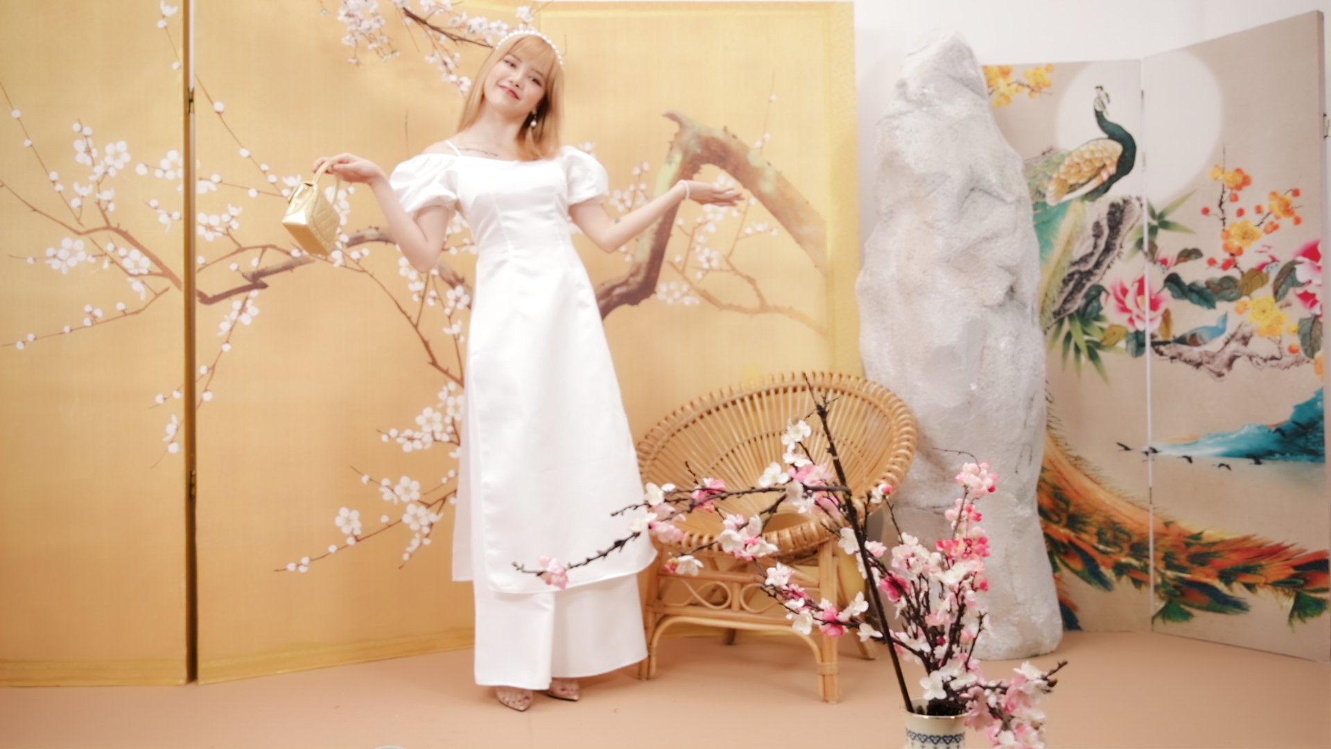 Với tiêu chí nhẹ nhàng, nữ tính, đẹp và thoải mái, phù hợp trong nhiều trường hợp, chúc Tết họ hàng, sang nhà người yêu hay xuống phố cùng bè bạn, 3 bộ áo dài mà Thiều Bảo Trâm đưa ra trong vlog đều khá phù hợp. thiết kế đầu tiên mang tông màu trắng trơn, thanh nhã. Chi tiết vai trần, tay bồng càng làm tăng thêm độ nữ tính, nhìn dịu dàng nhưng vẫn hiện đại, để thu hút thêm ánh nhìn, nữ ca sĩ chọn mix cùng hoa tai và bờm tóc ngọc trai - hot trend trong năm 2020 này, đồng thời mang thêm túi Chanel phom dáng nhỏ nhằm tăng độ thời thượng.
