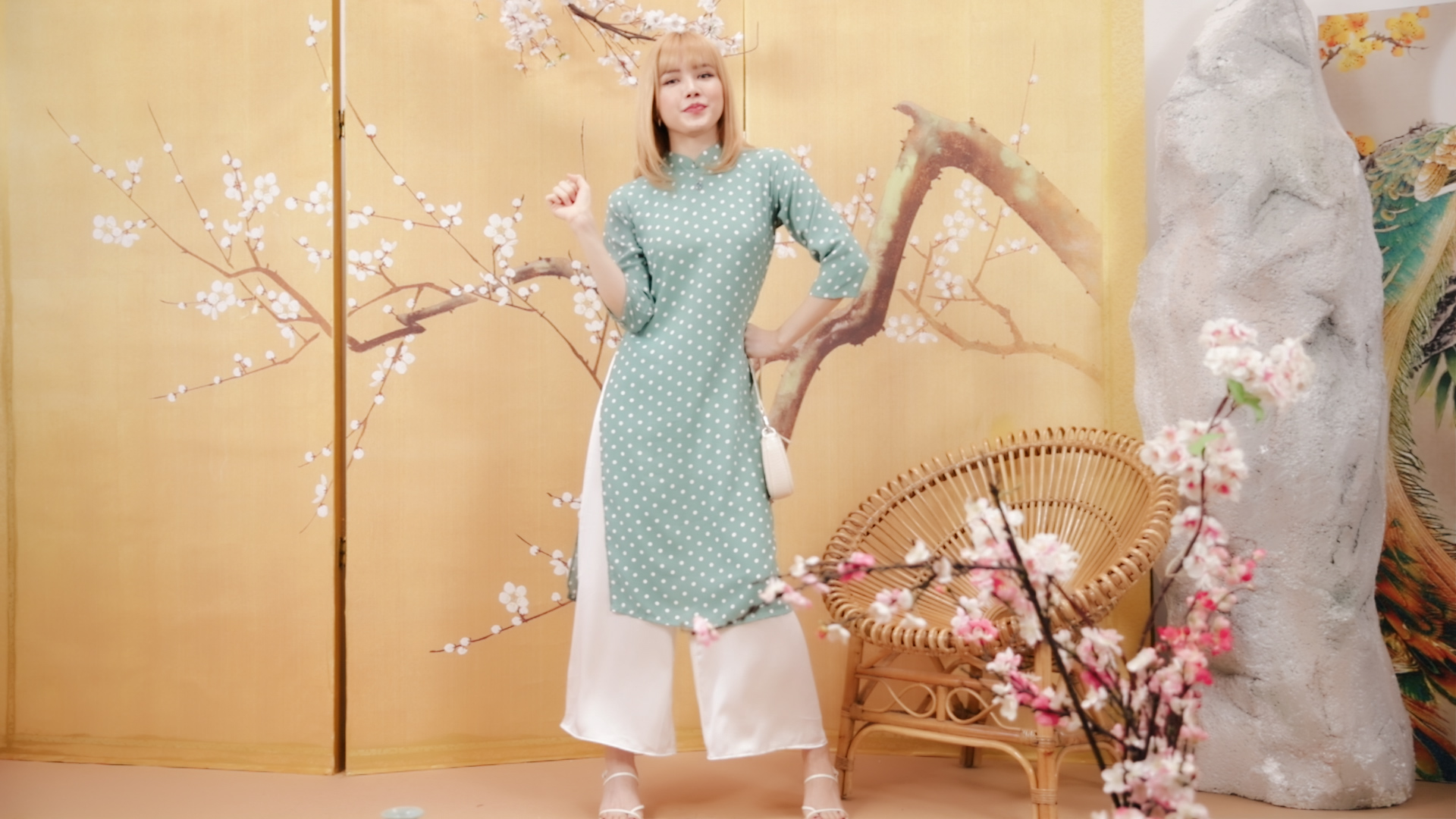 Gợi ý thứ 2 mà Trâm dành cho khán giả là bộ áo dài xanh chấm bi cực kì đáng yêu tinh nghịch, tay lỡ, phom dáng hơi suôn phù hợp với mọi dáng người như hình ảnh cô gái Việt thời đại mới, nhưng được kết hợp thêm bông tai, vòng cổ, túi đeo quai ngắn mang dưới tay đúng điệu, tạo nên cái nhìn hiện đại, cá tính hơn.