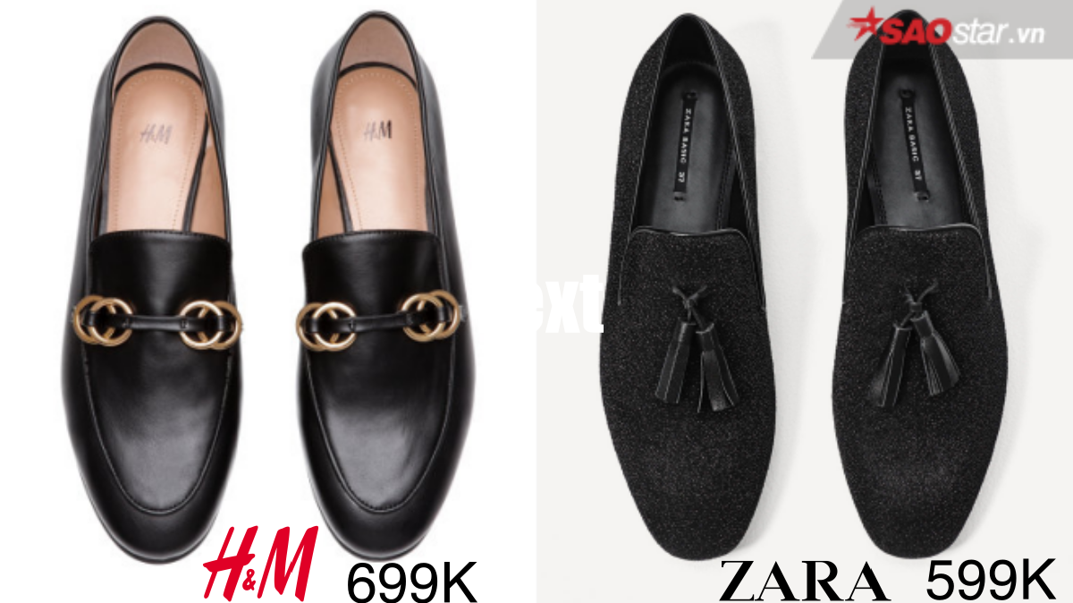 Vẫn là những đôi giày loafer tông đen huyền thoại nhưng cả hai nhà H&M và Zara lại có cách xử lý chất liệu và phom dáng riêng. Nhỉnh hơn với mức giá 100.000VNĐ, mẫu giày của ông lớn đến từ Thuỵ Điển - H&M lại trông có vẻ bắt mắt hơn nhờ vào chất da thời thượng cùng khuyên kim loại ánh vàng.