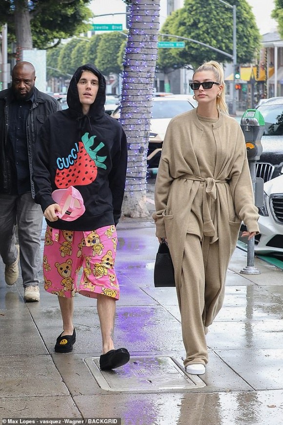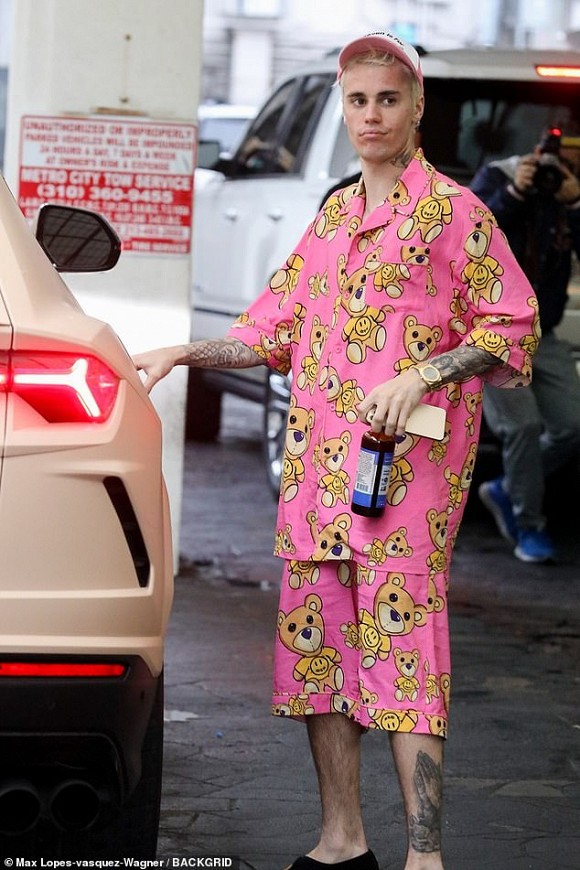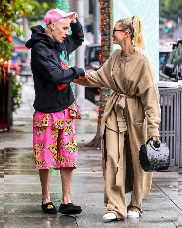 Justin Bieber ra phố mặc đồ ngủ màu hồng họa tiết gấu nhìn như đứa con nít khi đi cạnh vợ xinh đẹp