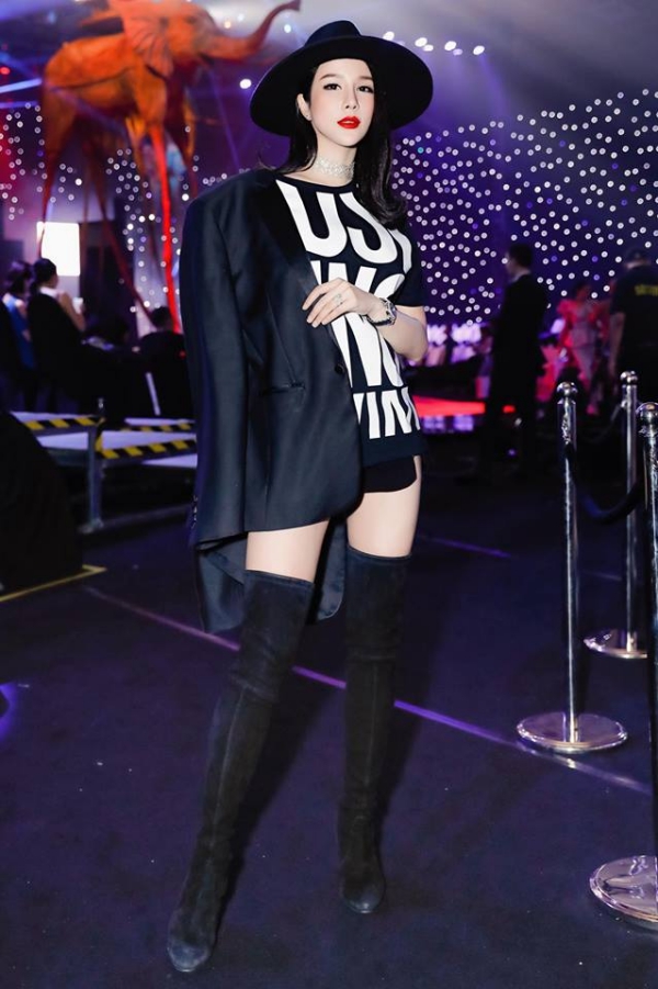 Tại một show diễn thòi trang vào cuối tháng 6, Diệp Lâm Anh chia sẻ tin vui đã mang thai bé gái được 4 tháng. Dù sắp trở thành một bà mẹ bỉm sữa, cô vẫn giữ vững phong cách ăn mặc từ cá tính đến gợi cảm. Ở sự kiện này, nữ diễn viên - ca sĩ diện áo thun kết hợp quần short, áo vest khoác ngoài và boot cổ cao tông màu đen ton-sur-ton.