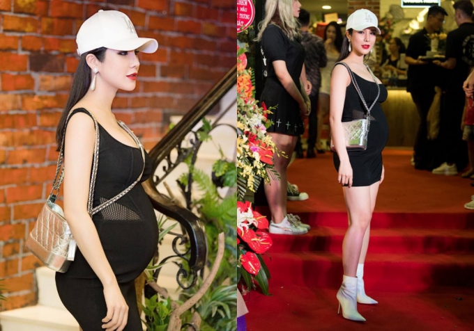 Mang bầu khoảng 6 tháng, bụng khá lớn nhưng Diệp Lâm Anh vẫn chuộng kiểu trang phục ôm sát cơ thể. Cô còn mang cả giày cao gót, phối túi Chanel Gabrielle giúp ngoại hình thêm sành điệu.