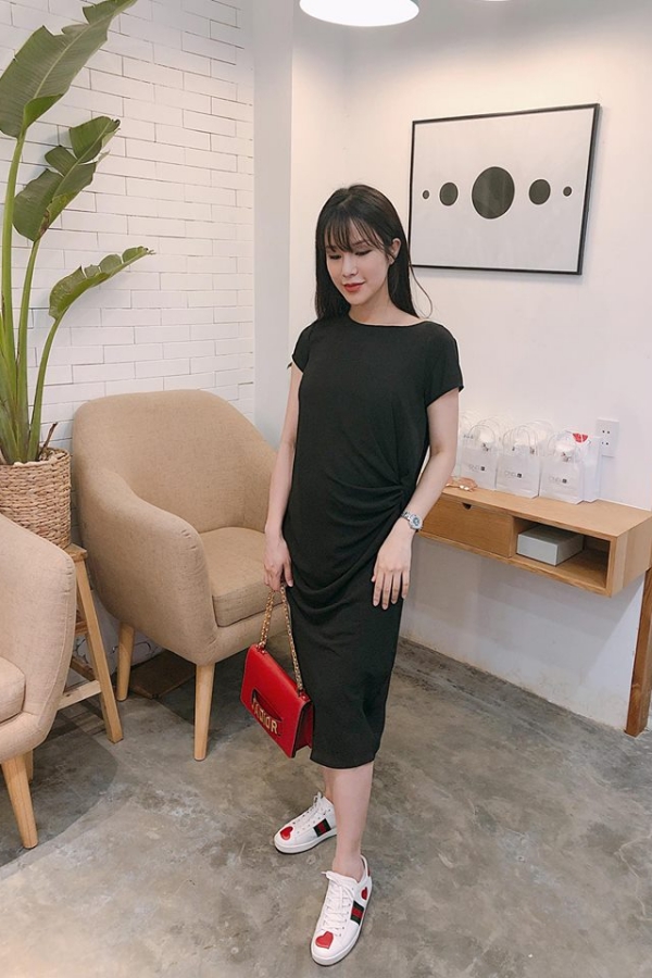 Màu đen có vẻ được Diệp Lâm Anh ưu ái khá nhiều vì nó giúp cô trông thon gọn hơn trong lúc tăng cân. Để tránh nhàm chán, cô chọn điểm nhấn màu trắng hay màu xanh cho các phụ kiện đi kèm.
