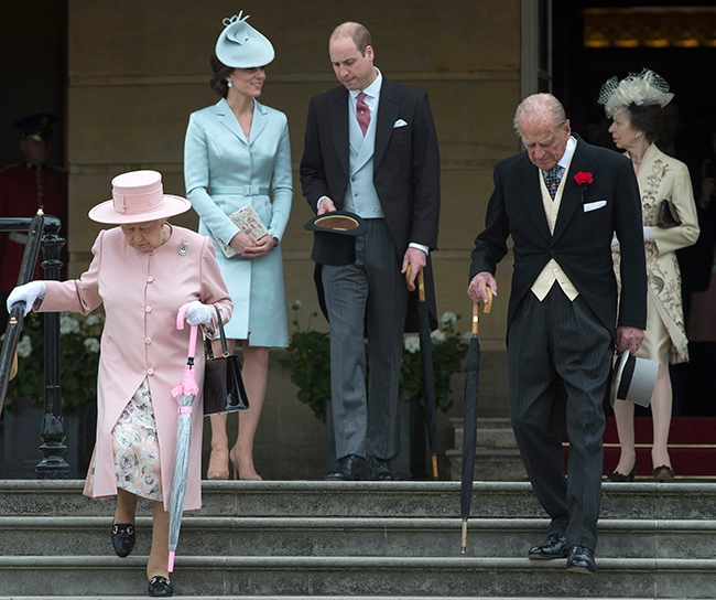 Tại buổi tiệc của nữ hoàng Elizabeth, nữ công tước xứ Cambridge chọn cho mình mẫu váy màu xanh ngọc kín đáo, thanh lịch của thương hiệu Christopher Kane cùng chiếc mũ đội đầu cầu kỳ đến từ John Lock and Co. Rất thích mặc đồ đôi cùng vợ, hoàng tử Anh chọn kiểu áo gile có cùng tone màu với Kate mặc bên trong bộ suit