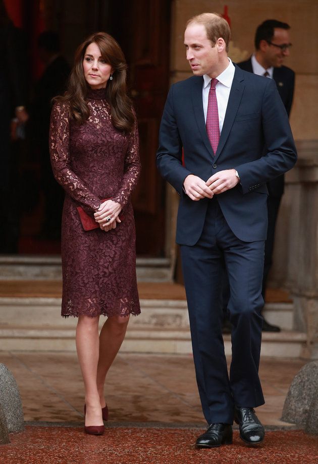 Quý phái trong kiểu váy ren Dolce & Gabbana tông đỏ burgundy trùng màu với cà-vạt của Hoàng tử William.