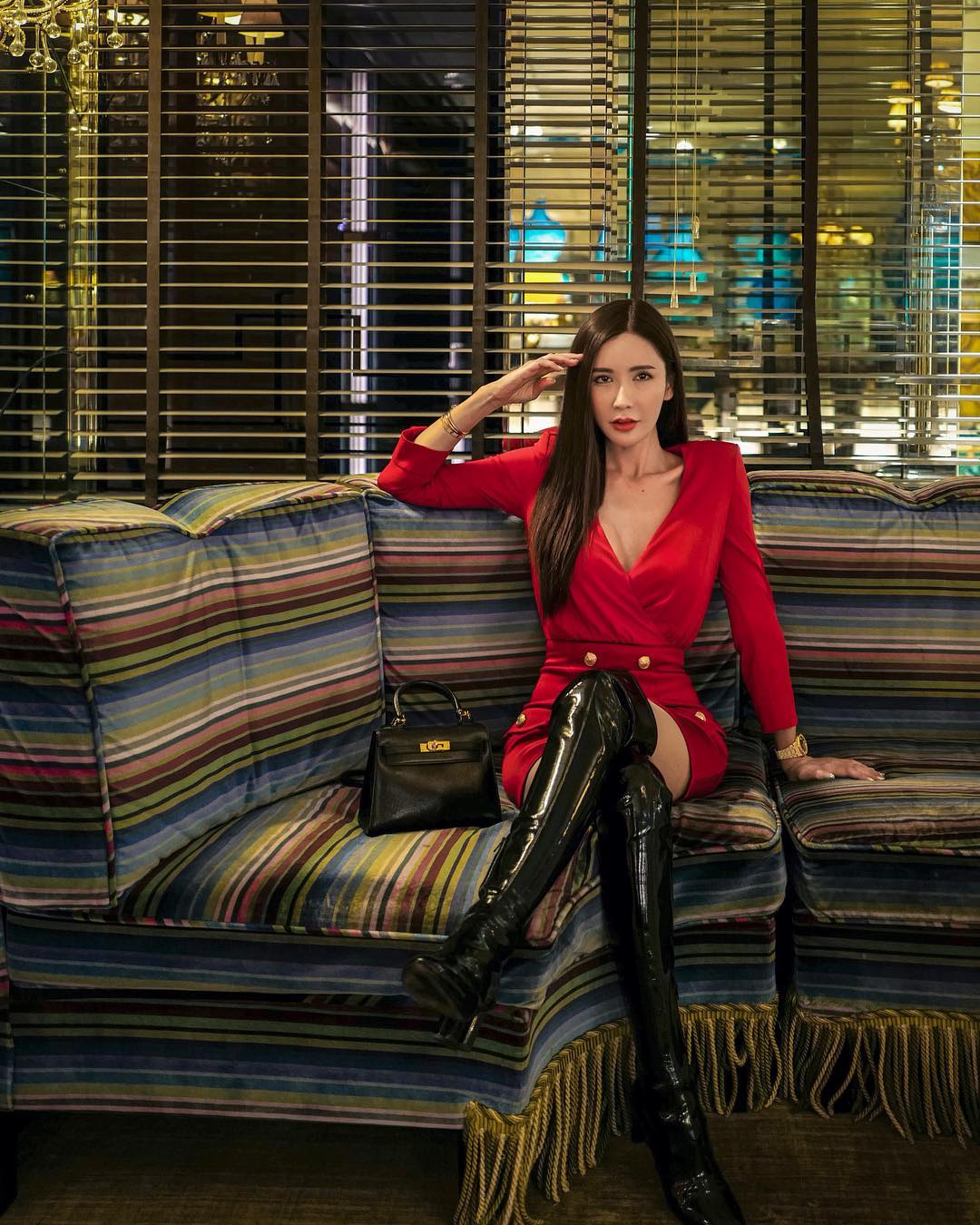 Bà hoàng Hermes nữ tính trong bộ váy đỏ cánh dơi thanh lịch không quên xách theo chiếc túi Hermes da cá sấu hàng limited.