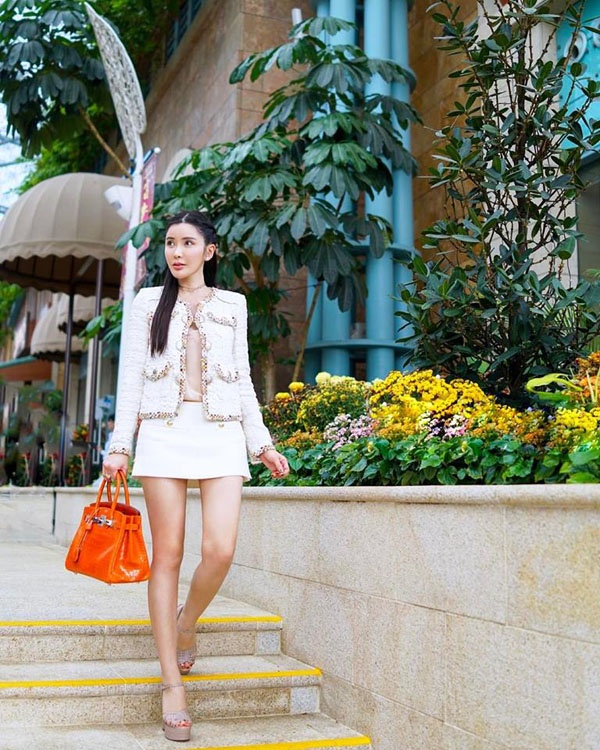 Thân hình thon thả đáng ngưỡng mộ cùng đôi chân dài trong trang phục vải tweed của nhà mốt Chanel với túi Birkin Hermes màu cam làm điểm nhấn.