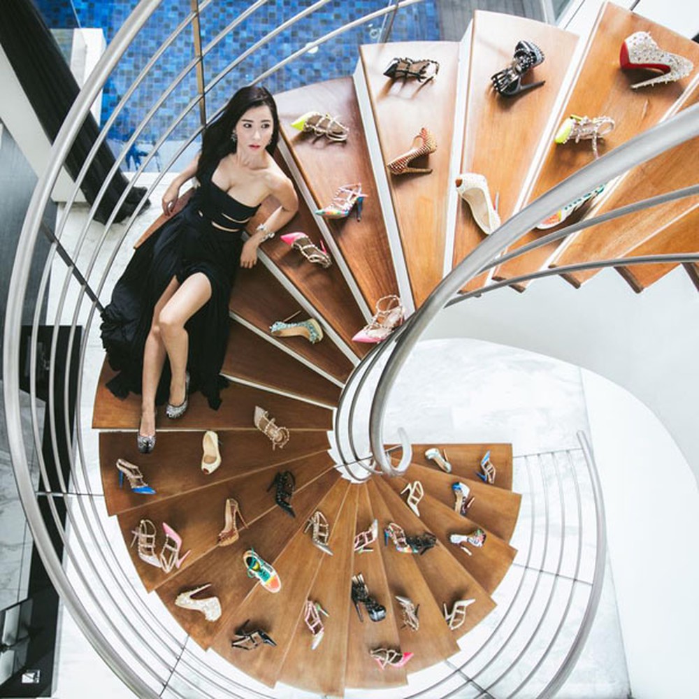 Một góc tủ giày của Jamie Chua khiến bao nhiêu cô nàng mơ ước. Nữ đại gia vô cùng ngầu trong trang phục đậm chất menswear với nguyên cây đen cùng blazer và boots đen hầm hố