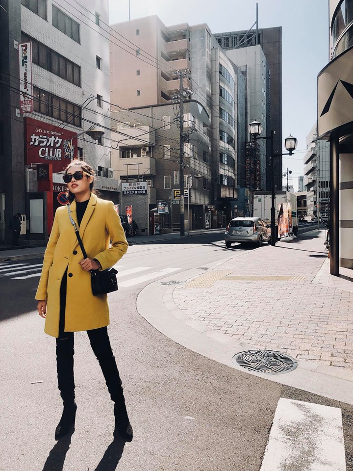Trang phục mùa Thu- Đông nổi bật với chiếc áo khoác vàng dáng dài khi xuống phố