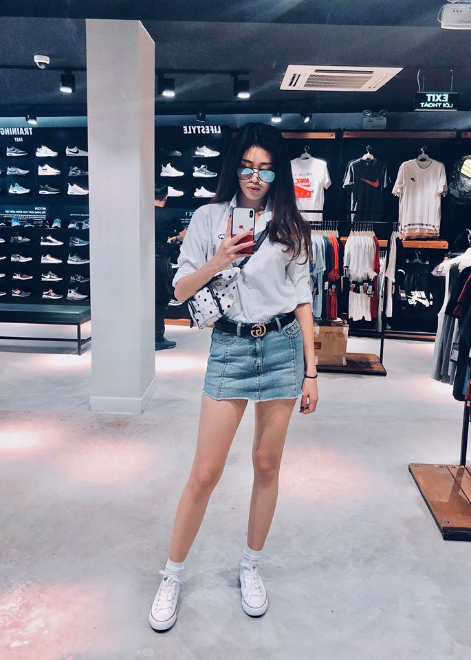 Nàng mẫu trẻ chọn cho mình chiếc áo sơ mi trắng kết hợp với váy jeans đi cùng giày sneakers trắng, phụ kiện là beltbag và mắt kiếng bạc tráng gương