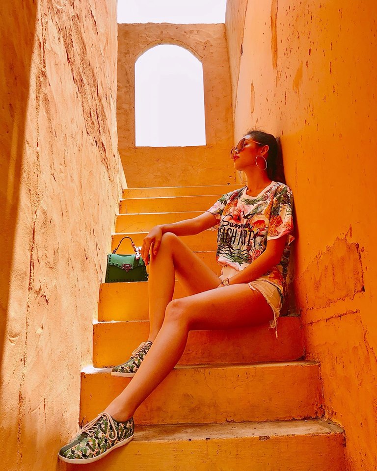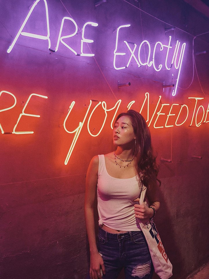 Áo thun và quần jeans luôn là trang phục yêu thích của bất kì cô gái nào không ngoại trừ Khánh Vân , nếu cảm thấy tổng thể quá đơn điệu hãy tô điểm thêm bằng giày và nón có màu sắc rực rỡ