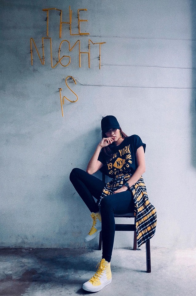 Sành điệu khi diện nguyên cây đen cùng phong cách thể thao xuống phố, với điểm nhấn là đôi giày thể thao cổ cao màu trắng dây vàng